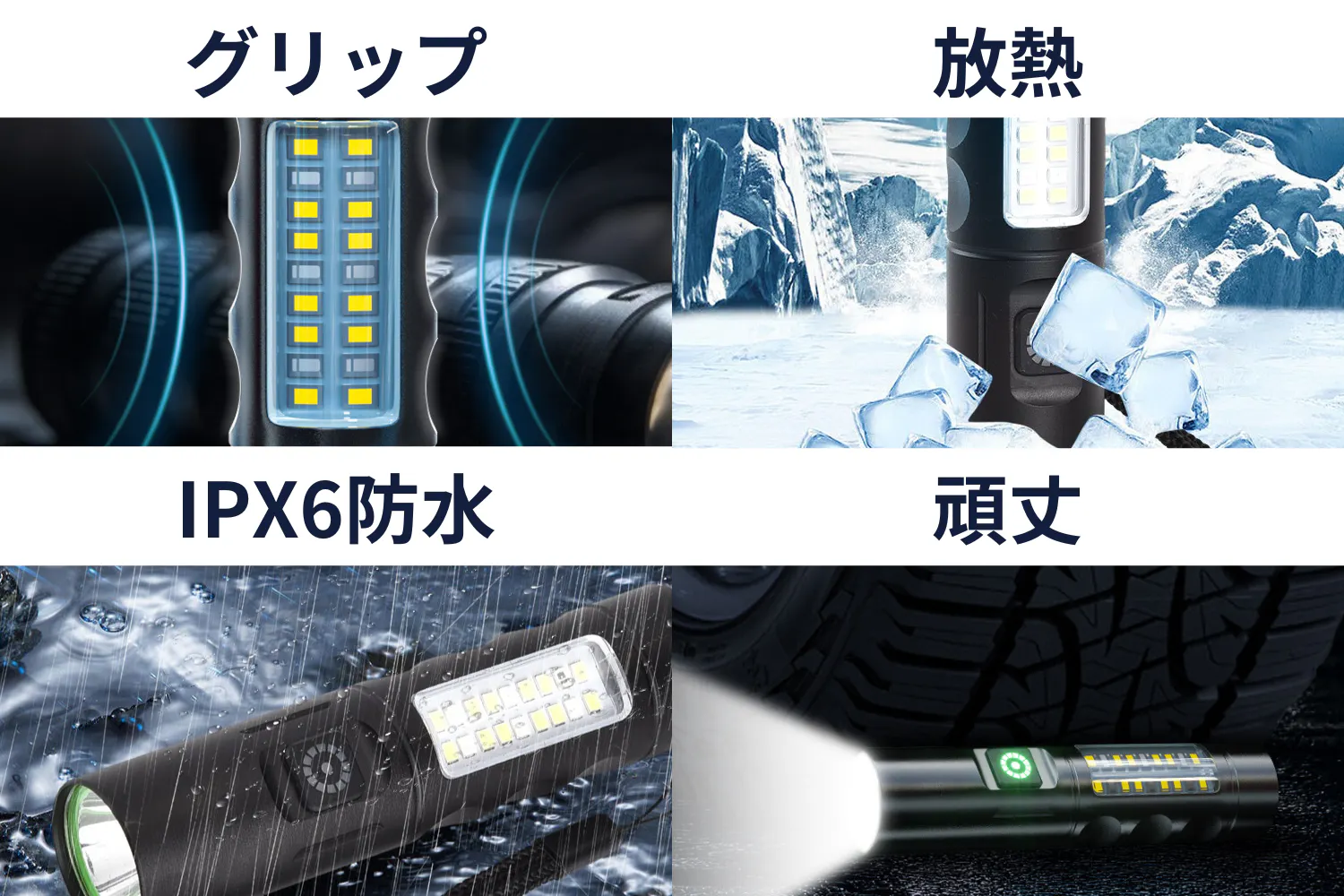 Type-C充電・握りやすいグリップ・長時間の使用でも安心の強力放熱・雨天時の使用も可能なIPX6防水仕様・壊れにくく頑丈なアルミ合金製ボディなど、利便性も抜群。