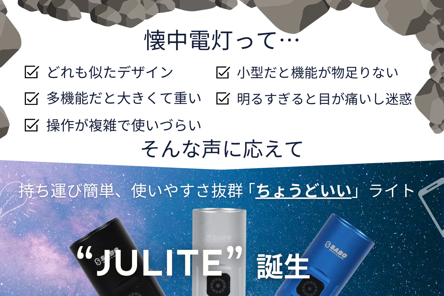 JULITEは、コンパクトで軽量(Lite)でちょうどいい(Just right)多機能懐中電灯(Light)を開発したいという発想から生まれた製品です。