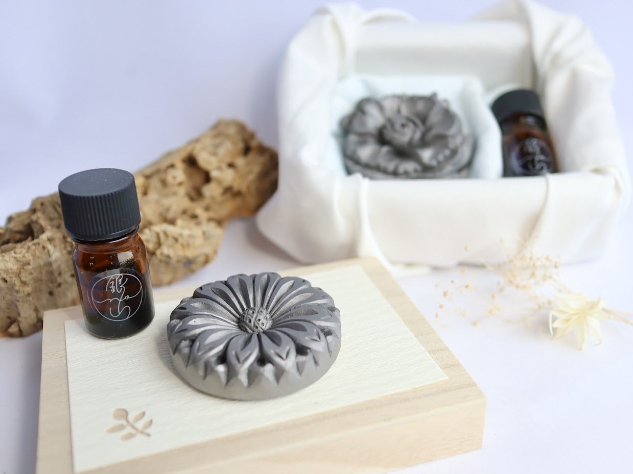 瓦の持つ吸湿性、吸水性に着目して、アロマオイルを最大限に生かして楽しむことができるアロマストーンです。香りの変化や色の変化を楽しみ、香りの持続時間を育てることができます。また瓦のマットな質感といぶし銀の落ち着いた輝きは、あらゆる場所に溶け込みます。