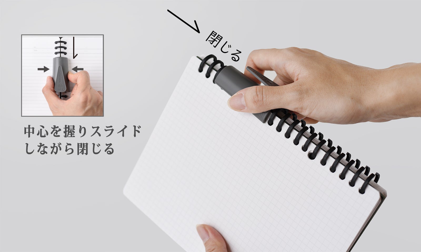 手またはボールペンのペン先でリングは開けますが、同封したリングジッパーを使うと、ファスナーのように素早く開閉することができます。