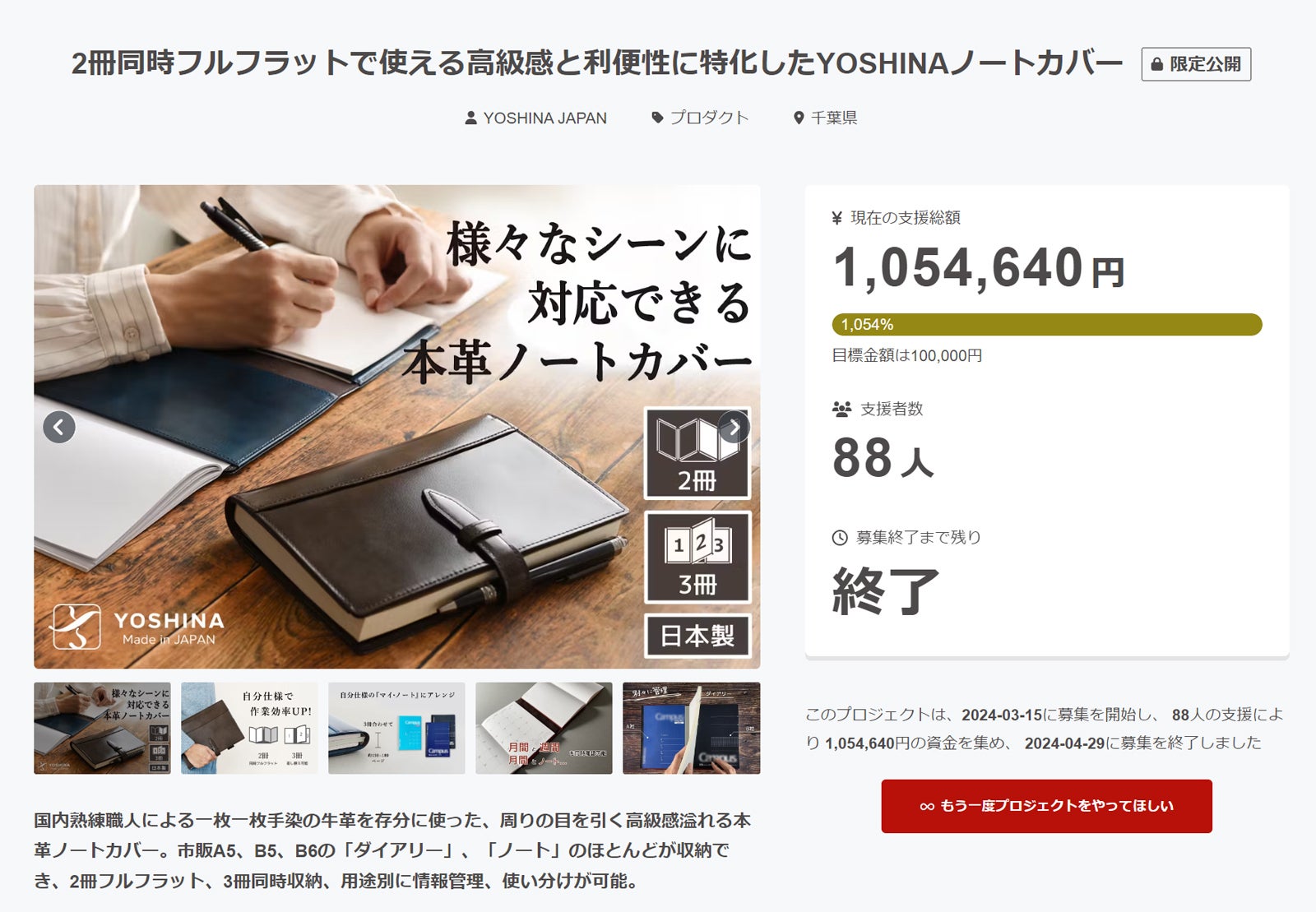 2025/05/24 20:00皆さまこんばんは。このたびは、弊社製品をご支援いただき、誠にありがとうございました。弊社は2020年、「良い品物を提供する」をモットーに、自社で企画・製造にこだわったブランド「YOSHINA」を立ち上げました。おかげさまでブランド設立から5年目を迎え、千葉県松戸市のふるさと納税をはじめ、日本全国の皆さまから温かいご支援をいただいております。改めまして、心より感謝申し上げます。その中、皆様からいただいた貴重な資金を活用し、文具製品に特化するブランド『notivo(ノーティフォー)』を立ち上げました。「notivoは、英語の「note(メモする)」とイタリア語の「vivo(活発な、生きている)」を組み合わせた造語で、「日々アクティブな暮らしを記録しよう」の想いを込めております。そして、「notivo」の第一弾製品として、天然タンニンで仕上げた革を使用した新製品が完成しましたので、ご報告申し上げます。---------------------------------------------------------------------------------------------------------------開始日:2025年5月25日 (日) 14:00書く派のあなたに、notivoがたどり着いた大人リングノートのご提案!https://www.makuake.com/project/notivo01/----------------------------------------------------------------------------------------------------------------①情熱を綴る、文具製品に特化した「notivo」のこだわりの大人専用リングノート。②市販A5(20穴)、B5(26穴)、A4(30穴)、ミニ(9穴)の用紙をきれいに差し替え可能!③東京産クロコダイル風型押し牛革と国産豚革を贅沢に使用し、ワンランク上の質感と実用性を実現!『書く派』の皆様に「より使いやすい」、「ワンランク上の質感」、「経年変化を楽しみたい」そして、「notivo」の立ち上げ記念として、ご支援頂いた製品と同じサイズのルーズリングをさらに1本差し上げますので、ぜひ、プロジェクトページをご覧いただければ幸いです。何卒よろしくお願いいたします。【追記】従来の「YOSHINA」ブランドにつきましても、引き続き財布や革小物を中心に、新製品の開発に努めてまいります。新たな製品が完成次第、改めて皆さまへご案内させていただきますので、今後とも変わらぬご支援のほど、何卒よろしくお願い申し上げます。NOTIVO スタッフ 一同 もっと見る