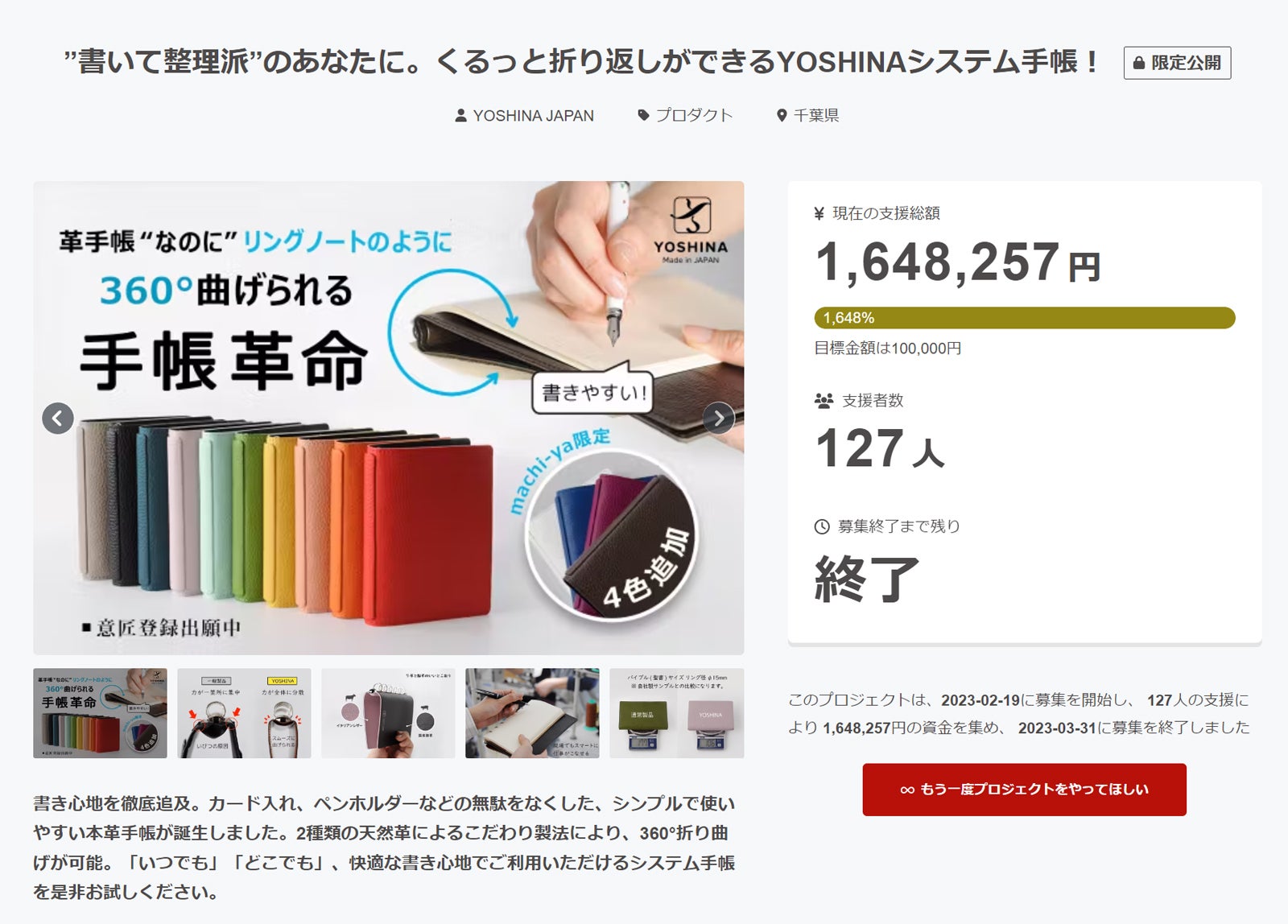 2025/10/24 22:00皆さまこんばんは。このたびは、弊社製品をご支援いただき、誠にありがとうございました。皆様からいただいた貴重な資金のおかげで、新製品の開発および製造に専念することができました。改めて心より御礼申し上げます。本日は、弊社のヒット製品「360°折り返して使えるシステム手帳」をベースに、警察官などの現場職の方々から寄せられた「中身を確実に収納しつつ、使いやすさを保ちたい」というお声をもとに開発した、弊社初のラウンドファスナー式システム手帳(ZIP手帳)が完成いたしましたのでお知らせいたします。---------------------------------------------------------------------------------------------------------------【大充実の30色展開】書いて整理派のあなたに、notivo折り返せるZIP手帳!https://www.makuake.com/project/notivo02/----------------------------------------------------------------------------------------------------------------① 昨年に続き、『システム手帳STYLE.10(趣味の文具箱 11月号増刊)』に掲載されたこだわりの一品。② ファスナータイプでありながら、弊社のこだわり製法により180°開きはもちろん、360°の折り返しも快適に使えるシステム手帳。③初登場の全30色展開。サポーター限定で「背面スリットポケット追加」オプションもご用意。『書く派』の皆様に、使いやすさを損なわず、確実に閉じられる安心感、そして、自分らしい色を選ぶ楽しさを感じていただけるよう、思いを込めて今回のプロジェクトを立ち上げました。ぜひ、プロジェクトページをご覧いただければ幸いです。何卒よろしくお願いいたします。notivo スタッフ 一同 もっと見る