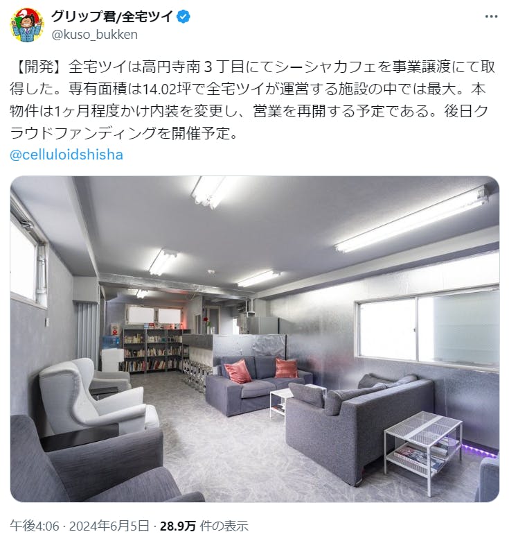 2024/08/10 07:30おまたせしましたっ!チャンスホールディングス6店舗目にして最大の広さ!(46㎡)そしてなんと!ソファに座れる!すごい!もちろん壁も天井もあるし、エアコンも効いてる!すごいすごい!みんなのたまり場、高円寺ケムリバ 8/10 12:00オープンです!まったりもできるし仕事もできる。事前に言ってくれたらボードゲームもできるよ。階段を50段登った先にあるみんなの秘密基地、高円寺ケムリバ。メニューはこんな感じです。週末は営業時間も朝までやってる!(8/18~)終電逃しても高円寺で遊べるぞ!俺達高円寺不動産キッズ、煙を吐きながら儲け話カマそう。皆さんのご来店をお待ちしておりますっ!場所はアーケードのあるパル商店街の中。雨でも濡れずに高円寺駅から来れます。↓フォローしてねhttps://x.com/Kemuribaみんなとモクモクするのを楽しみにしてるぜ!かずお君 もっと見る