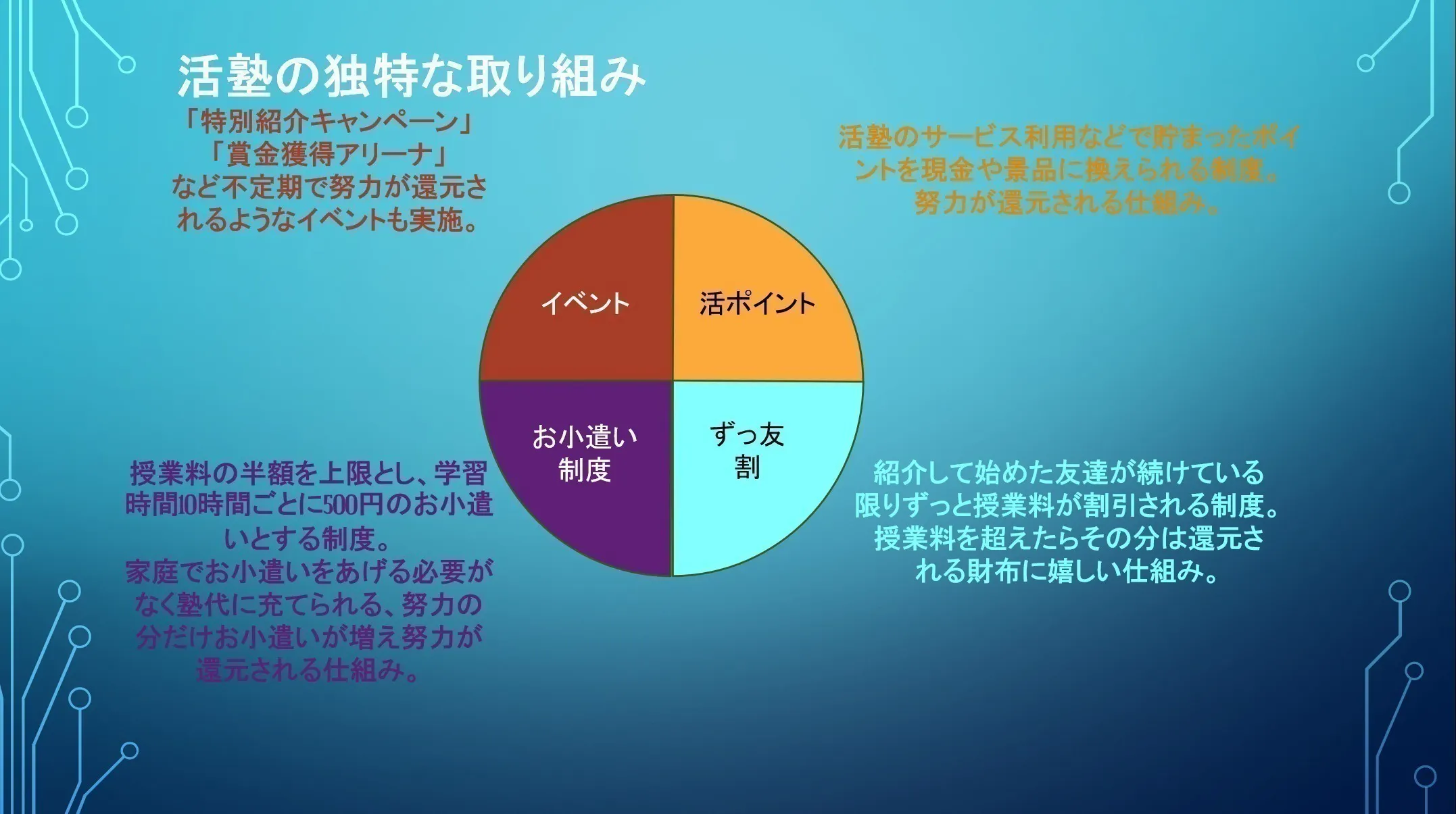 現在のアミューズメント要素としては、主にはポイントを貯めて還元できる仕組みがあります。自分の頑張りが還元される。貯めて使えるといった趣旨です。活塾HPに詳細がありますので是非ご覧ください。