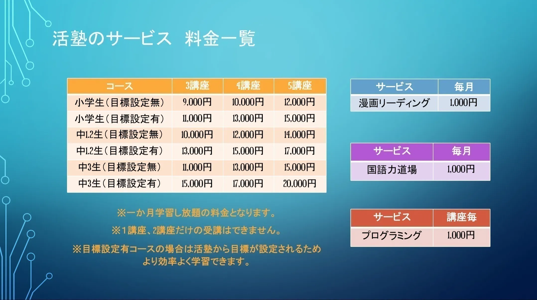 それらを仕組みとして安価に用意できる塾を実現させたいと強く想っています。