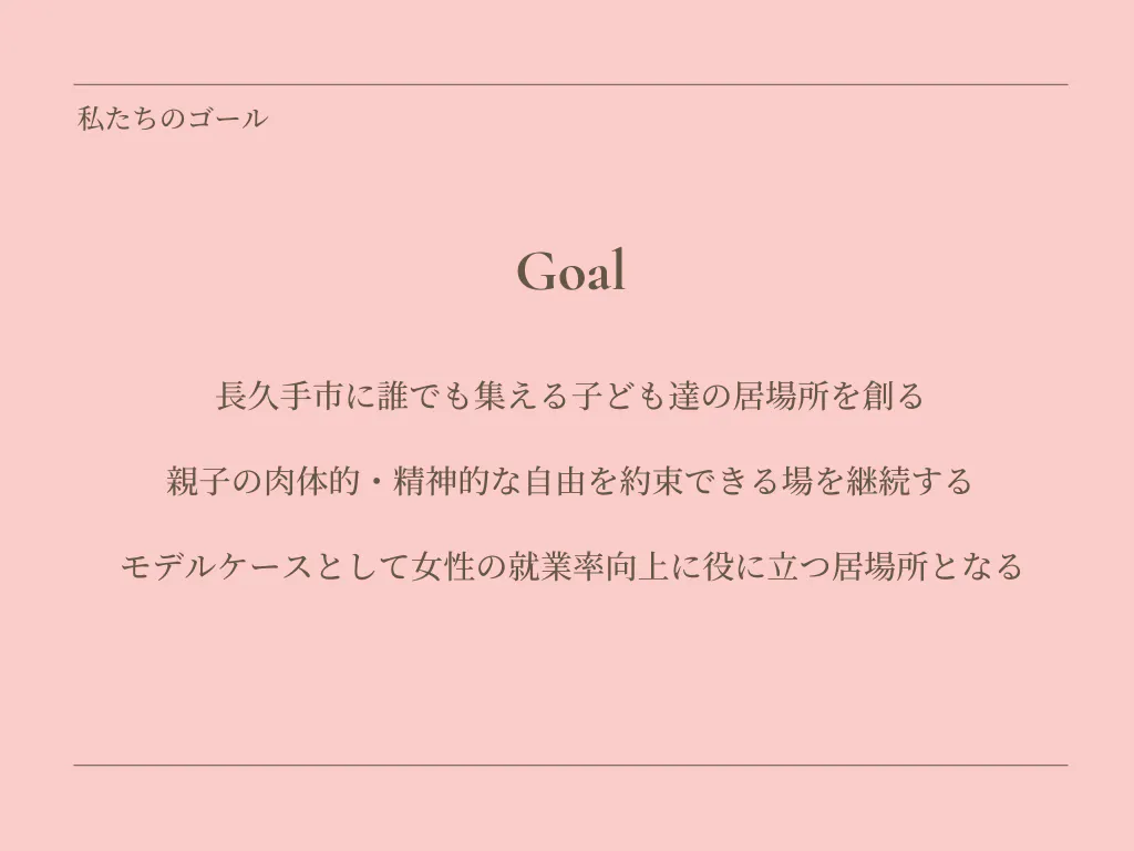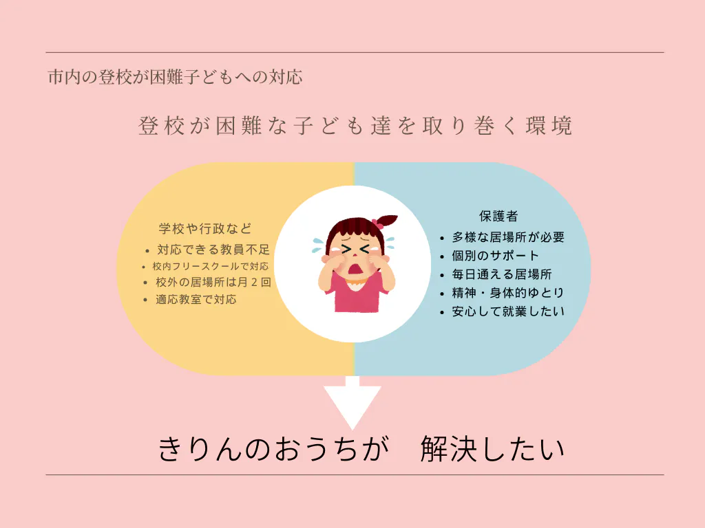 長久手市には不登校の子どもたちが気軽に毎日通えるフリースクールが無い状況です。昨年度の教育委員会からの報告では、市内に約200人の学校に通うことが困難な子どもがいます。学校に通うことが困難な子どもたちが安心して過ごせる場所を提供するためにも「きりんのおうち」は役に立つことができると確信しています。
