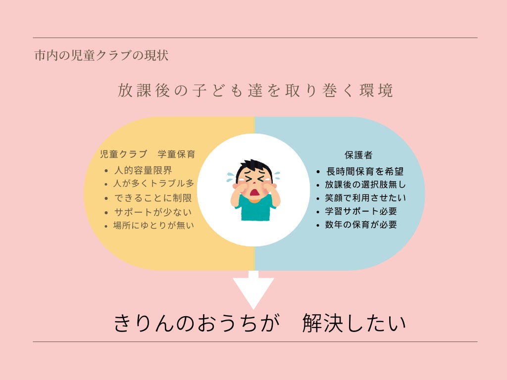 長久手市には不登校の子どもたちが気軽に毎日通えるフリースクールが無い状況です。昨年度の教育委員会からの報告では、市内に約200人の学校に通うことが困難な子どもがいます。学校に通うことが困難な子どもたちが安心して過ごせる場所を提供するためにも「きりんのおうち」は役に立つことができると確信しています。