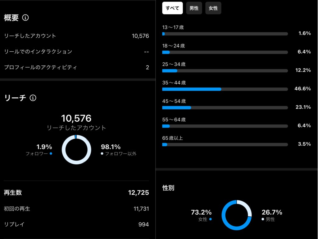 リール動画1本辺りのリーチ数は2千から1万アカウントです。
