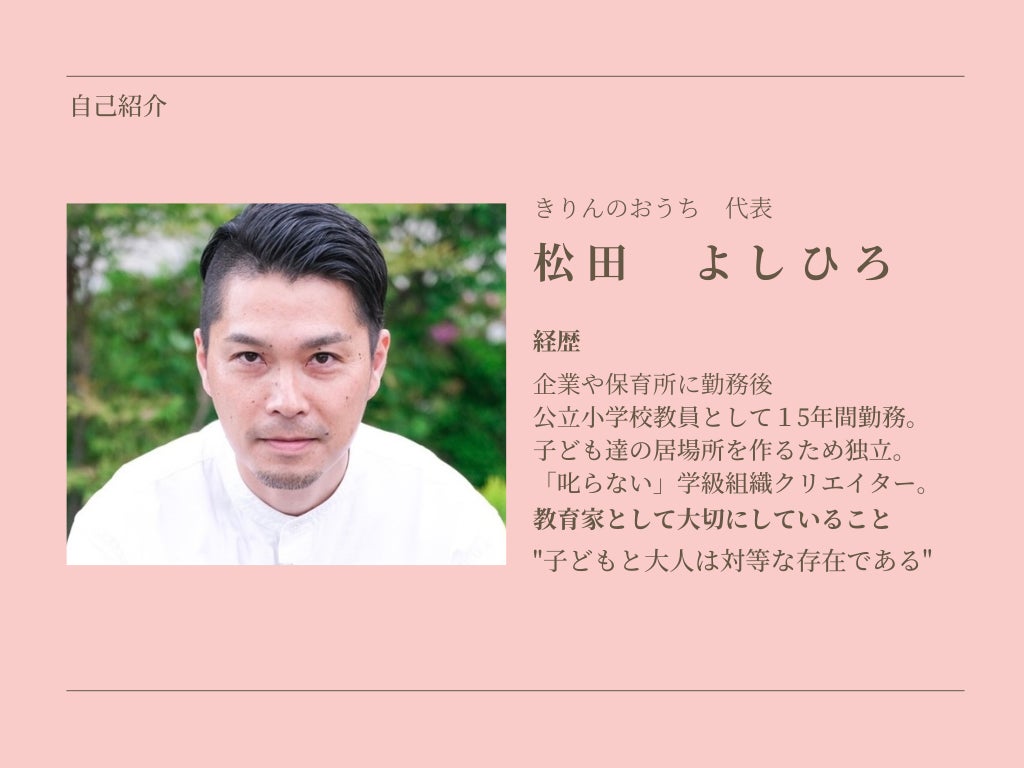 私は「きりんのおうち」という学童保育所×フリースクールを運営している松田です。今年の4月にジブリパークがある長久手市に子ども達の居場所をオープンしました。長久手市は日本で一番平均年齢が低い市町村として注目されていますが、子どもたちの居場所の整備が追いついていません。私たちは市民として、長久手市で子どもを育てる親として、その問題を解決し、子どもたちが安心して過ごせる場所を提供するために活動しています。