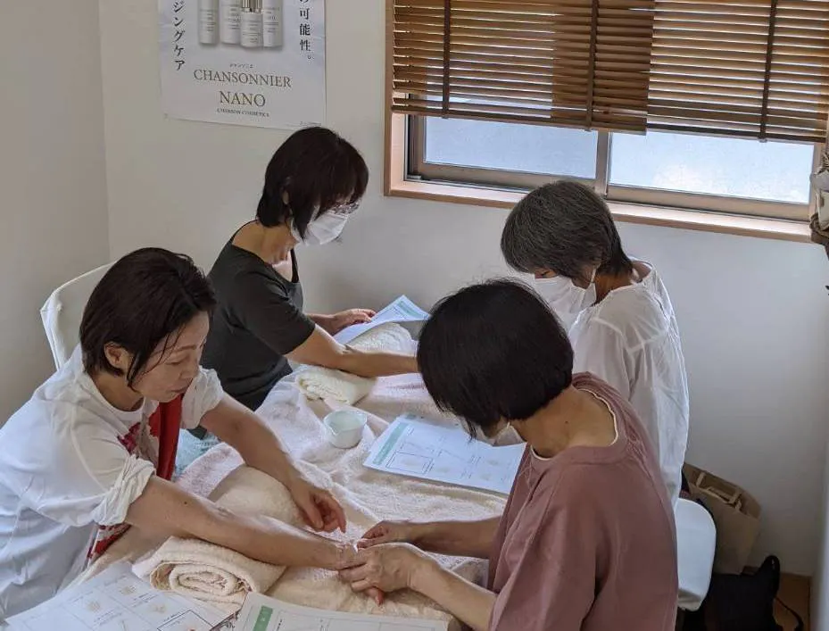 ⽪膚学等の座学から始まり腕・⾜のマッサージの実技まで。あと⼀回で修了予定です。