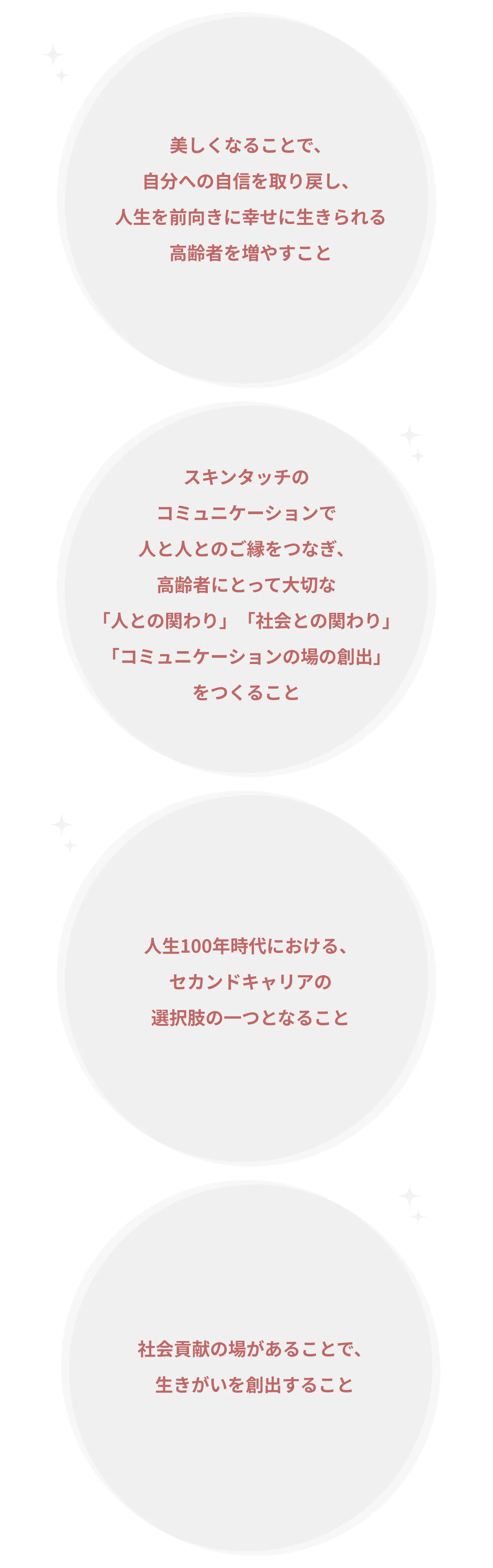 高齢者自身が美を提供する側になることで、心と体の健康と生きがいを創出したり、「いくつになっても元気でいたい」「美しくありたい」といった美意識や健康意識を高めたりする効果を発揮します。
