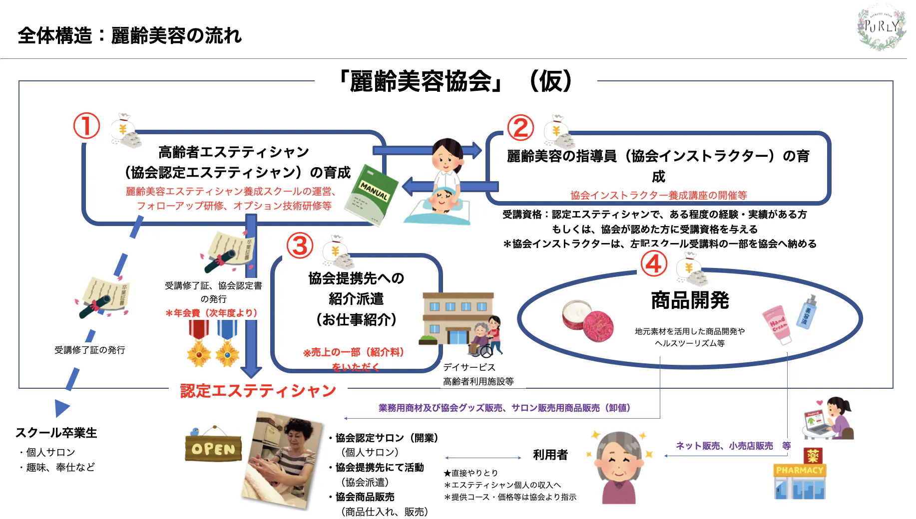 高齢者エステティシャンの育成のほか、麗齢美容の指導インストラクターの育成、協会提携先への紹介派遣、商品開発まで一環して手掛けていきます。