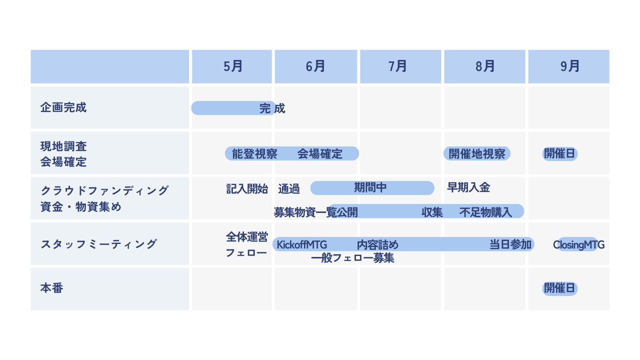 イベント全体は5月から9月の企画期間で、子どもたちの好奇心・冒険心の可能性を叶えるため、現在運営をしている8人のメインスタッフ(以下 全体運営フェロー)と公募を行う50人近くのスタッフ(以下 一般フェロー)で能登半島に向かいアートプロジェクトを実施する。