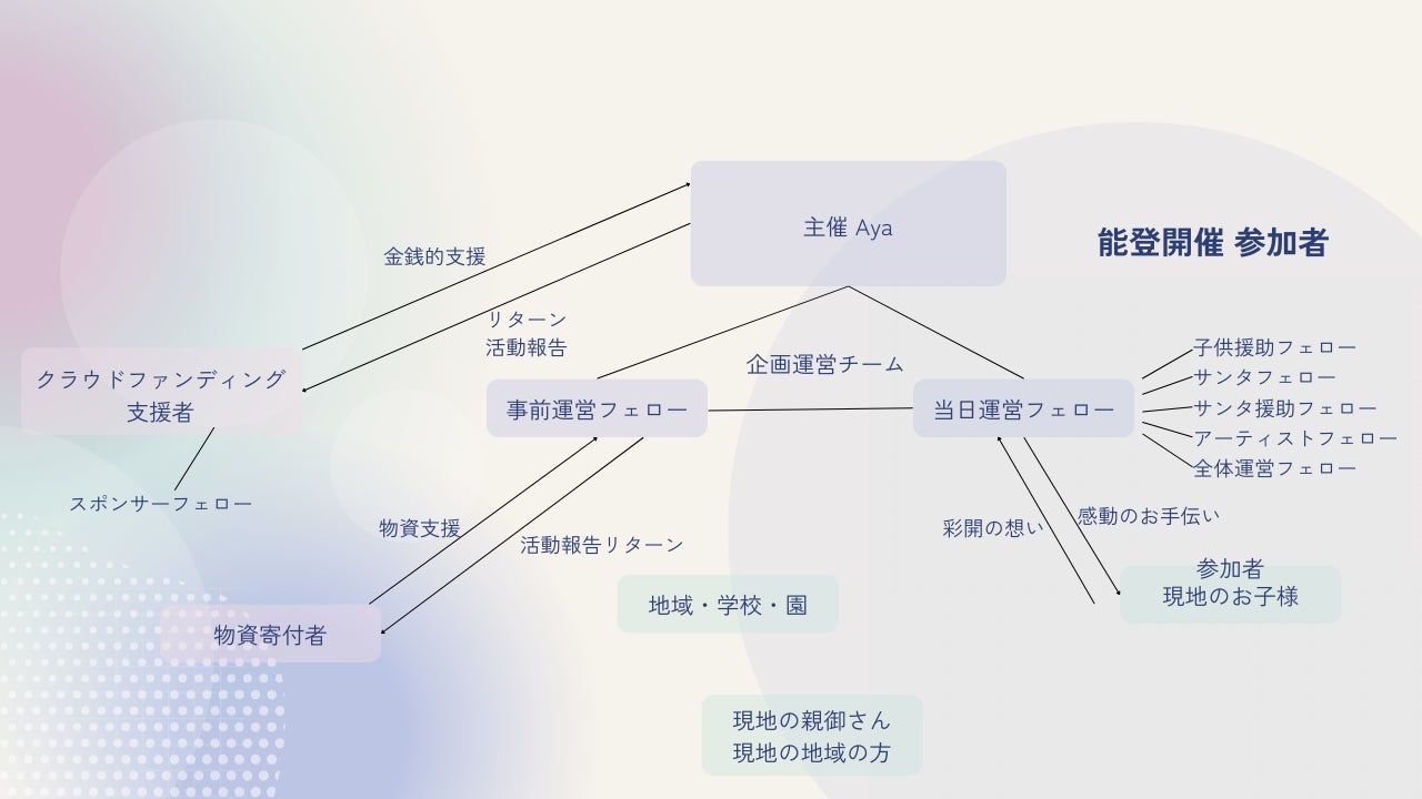 イベント全体は5月から9月の企画期間で、子どもたちの好奇心・冒険心の可能性を叶えるため、現在運営をしている8人のメインスタッフ(以下 全体運営フェロー)と公募を行う50人近くのスタッフ(以下 一般フェロー)で能登半島に向かいアートプロジェクトを実施する。