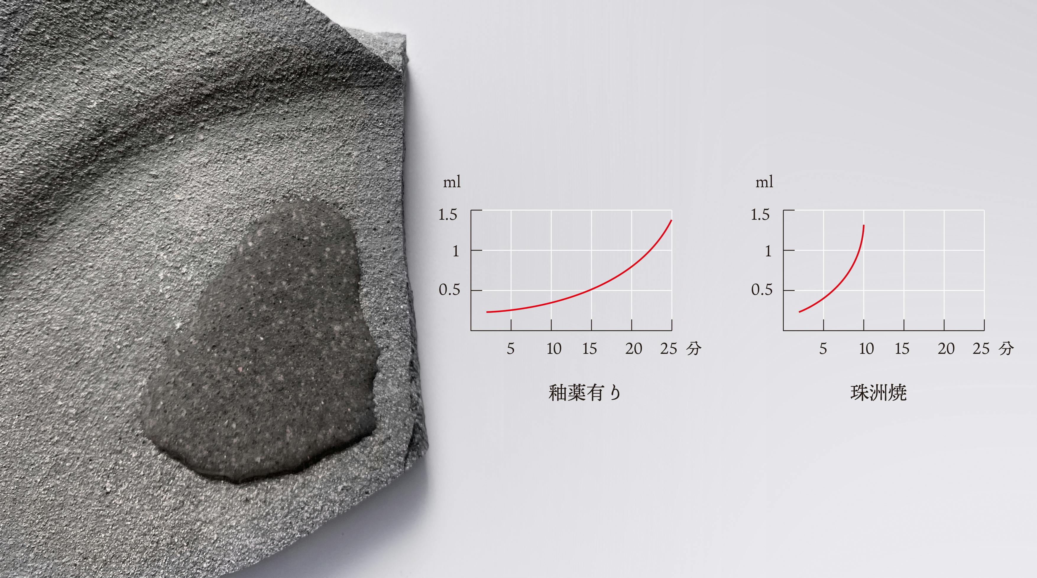 ↑アロマオイルが吸収される速さの実験の結果、通常の釉薬を塗られた陶器に比べ、2 倍以上の速さでアロマオイルが吸収され、香りが空間に拡散されました。また、アロマオイルのしみ込んだ跡が残るため、表面模様の経年変化による震災から復興までの時の経過が可視化できます。