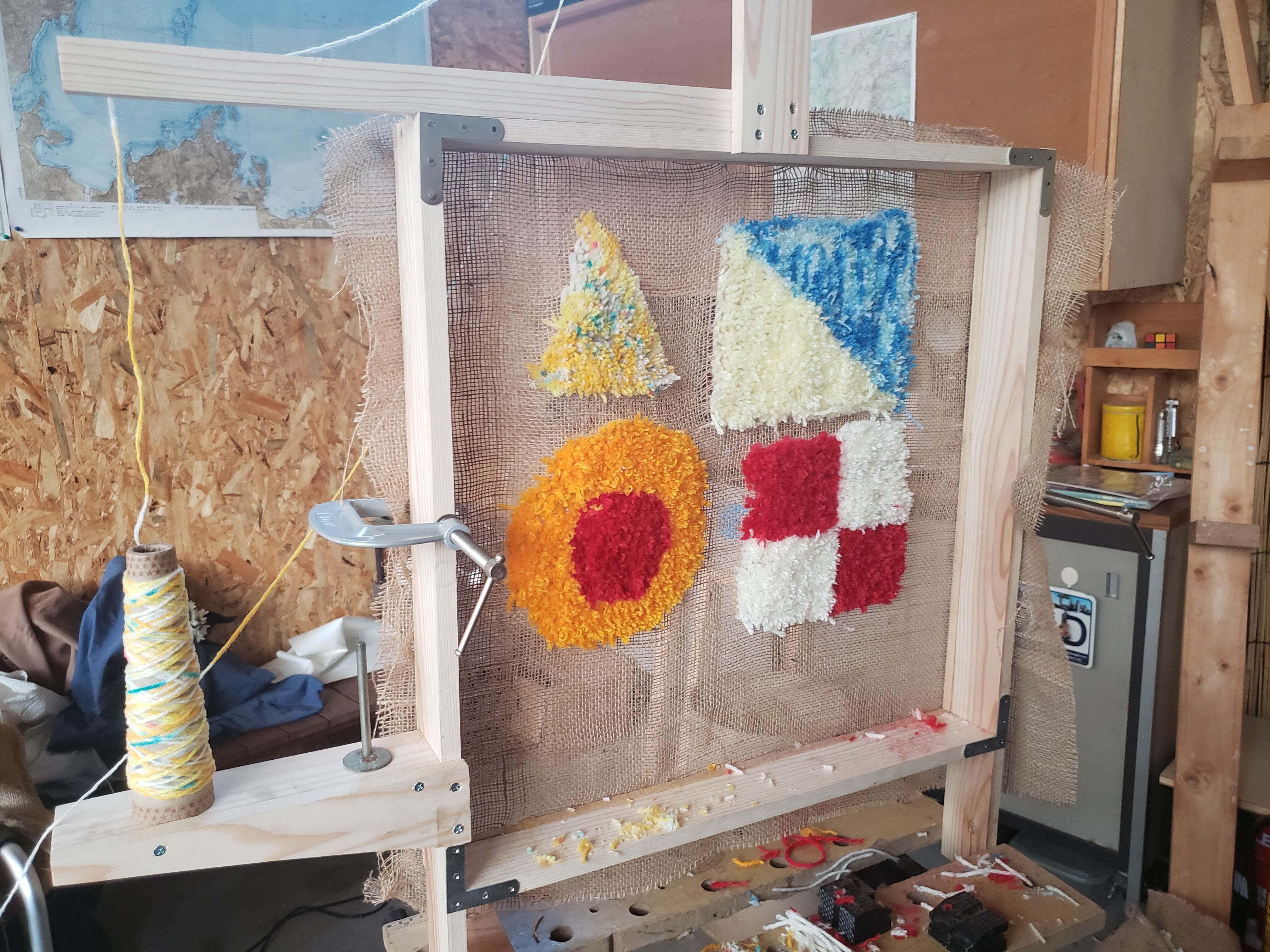 当時の写真を見返すと、ホームセンターで購入した麻布(本来は専用の基布が必要)がかなりたゆんでおり、不安定な木枠の構造と設置方法に思わず笑ってしまいます。何度もタフティングガンに糸が絡まったことも覚えています。こんな状態でまったく上手く作業が進まず、大変苦戦しました。