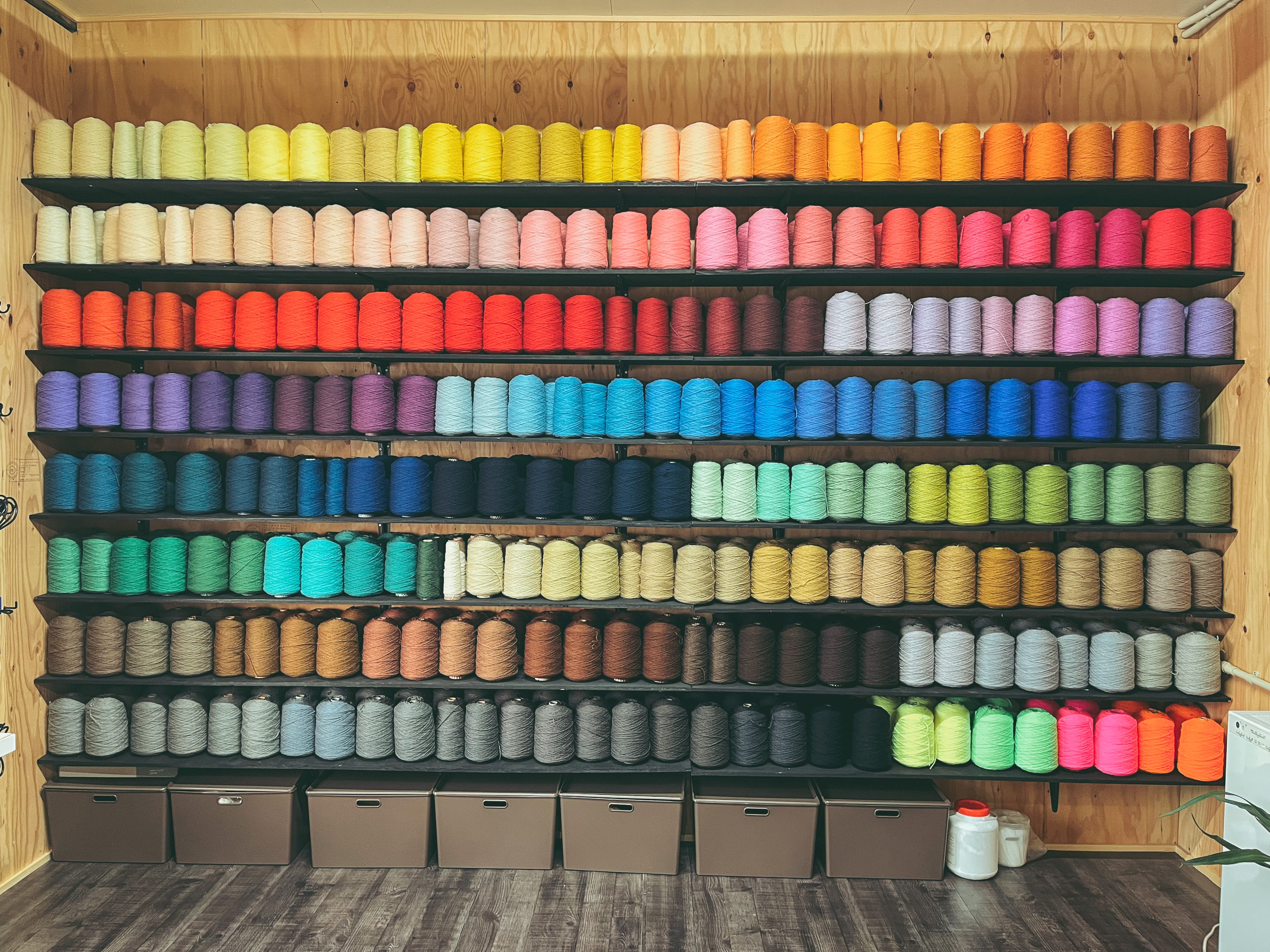今年5月、タフティングに使いやすい淡い色を中心に、新たに15色を作りました。しかしこの新色15色が、棚に並びきらない!更に現在、アトリエに並べている糸はアクリル中細の1種類ですが、バックヤードには他にも数多くの種類の糸(アクリル、ウール、意匠糸など)が待機しています。