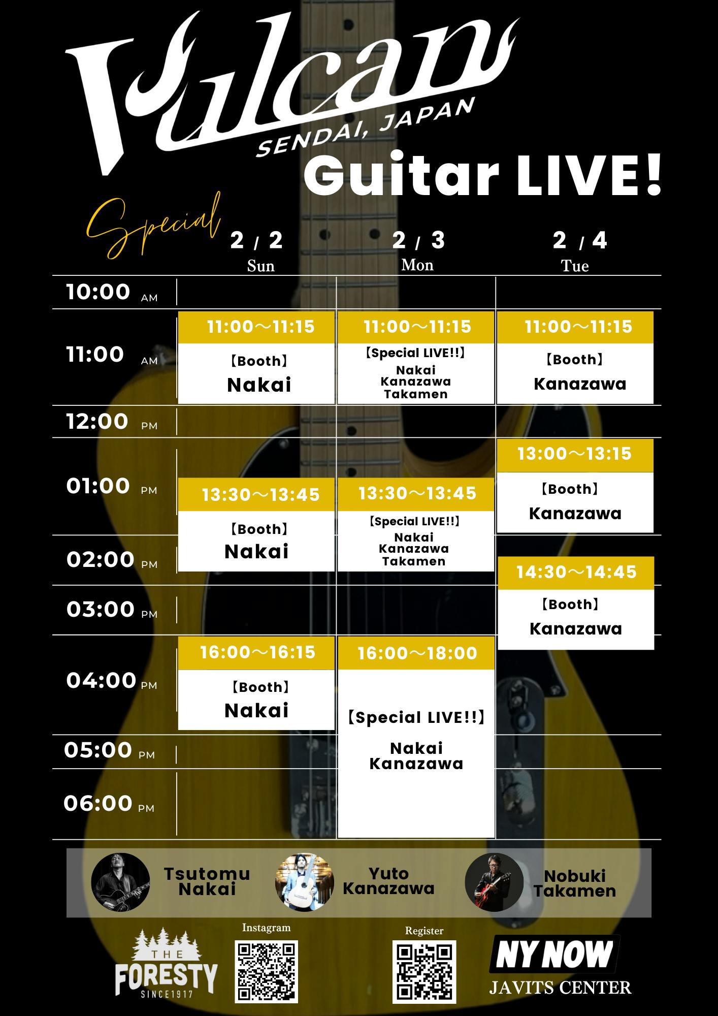 我らが「Vulcan Guitar:Leatherシリーズ」を存分に奏でて頂きます(なお2日目、2/3は贅沢にも3名勢揃い!ハッピーアワー・ラウンジでのセッションが繰り広げられる予定!!!)