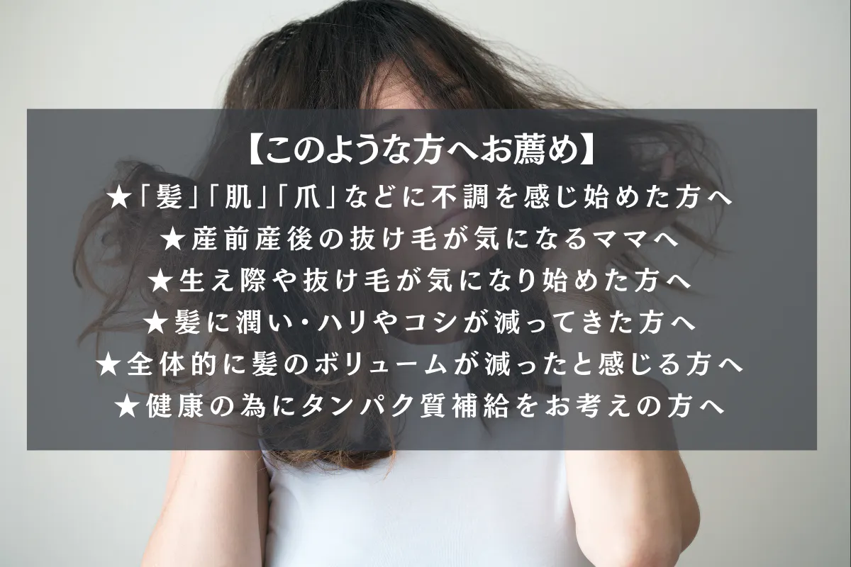 例えば、一人暮らしで不規則な食生活や年齢的に食が細くなっていくなどの食生活の変化によって起こる「慢性的なタンパク質不足」は、身体にとって様々な不調をもたらしますが、そのような状態が続くと「抜け毛」「薄毛」といった髪の毛のトラブルにも発展してしまいます。