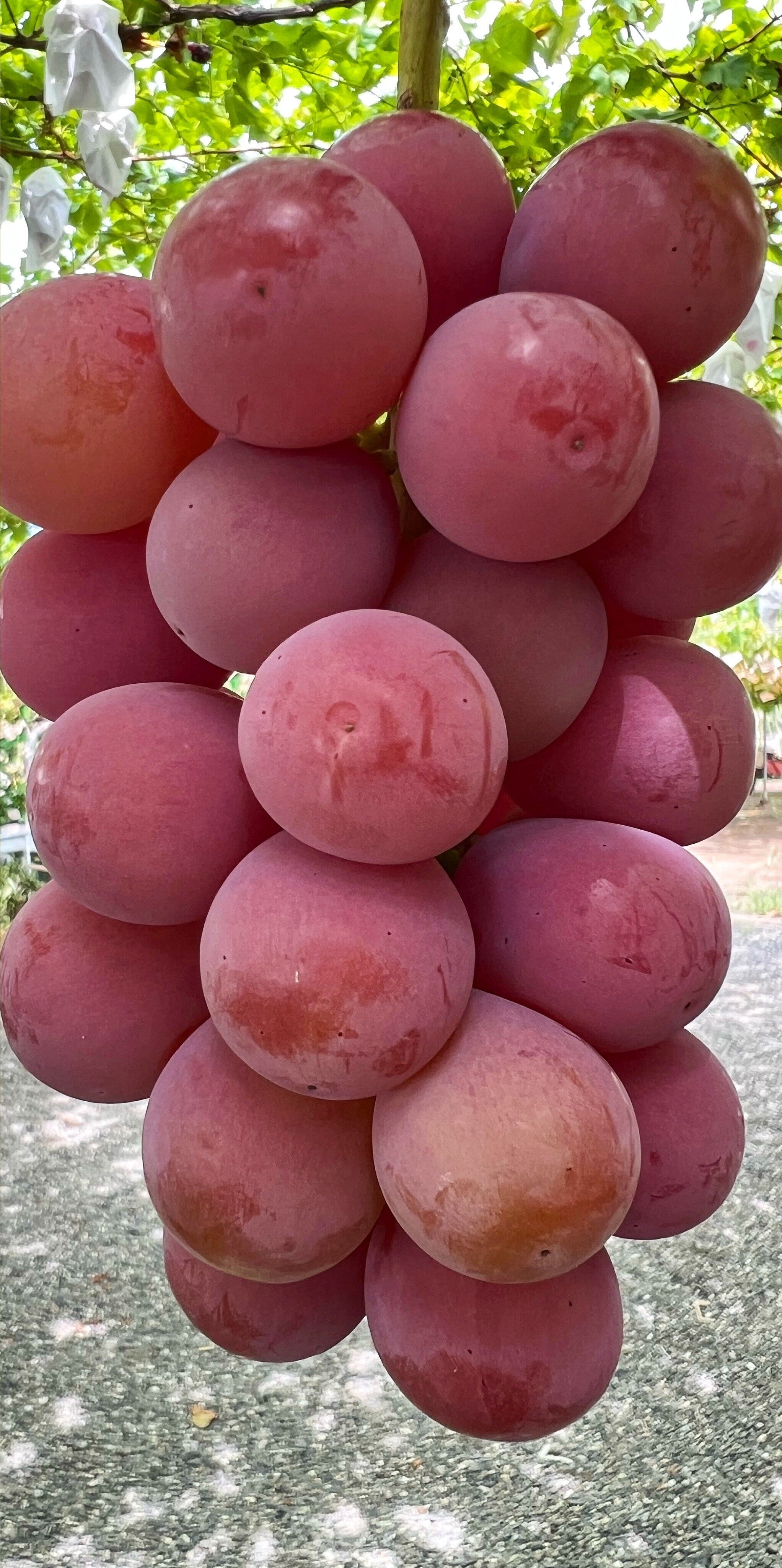 片親に安芸クイーンを持つクイーンニーナ。「安芸津20号」×「安芸クイーン」の交配種で、2011年に品種登録されたぶどうです。 旧系統名である「安芸津27号」の「27」と、スペイン語で女の子を意味するNINA(ニーニャ)にちなんで「クイーンニーナ」と命名されました。外観は安芸クイーンのような果皮のグラデーションは見受けられませんが、ピンク色が実に美しい赤系葡萄です。果肉は安芸クイーンに比べ白っぽい印象です。フォクシー香と呼ばれるグレープジュースのような甘い香気のある品種です。安芸クイーン同様酸が低く甘いのが特徴の品種ですが、時間を置くとより一層甘く感じられます。