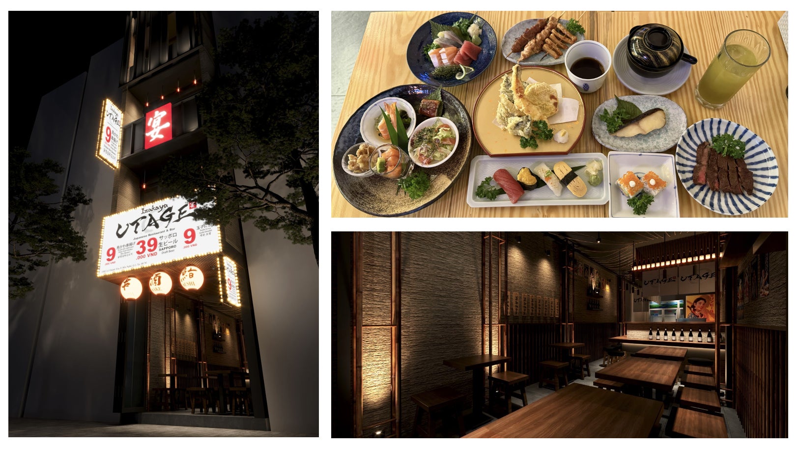 料理は、日本から取り寄せた魚を使った本格江戸前寿司をはじめ、現地の食材を使った居酒屋メニューをご提供します。ベトナム人をターゲットにしてリーズナブルな価格帯とし、日本でも人気の定番居酒屋メニューをベトナム人でも食べやすい味付けに調整して提供します。また、ビールや焼酎などのスタンダードな飲み物のほか、料理によく合う日本酒など、居酒屋には欠かせない飲料もバリエーション豊かに用意します。Izakaya UTAGEのオープン時のメニュー数は約200品を予定しています。