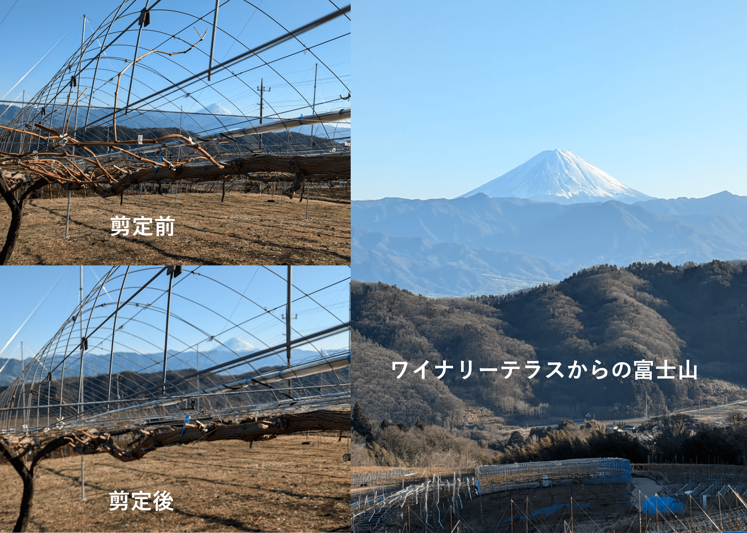 短梢仕立てのシャインマスカット剪定前と剪定後の写真です。
