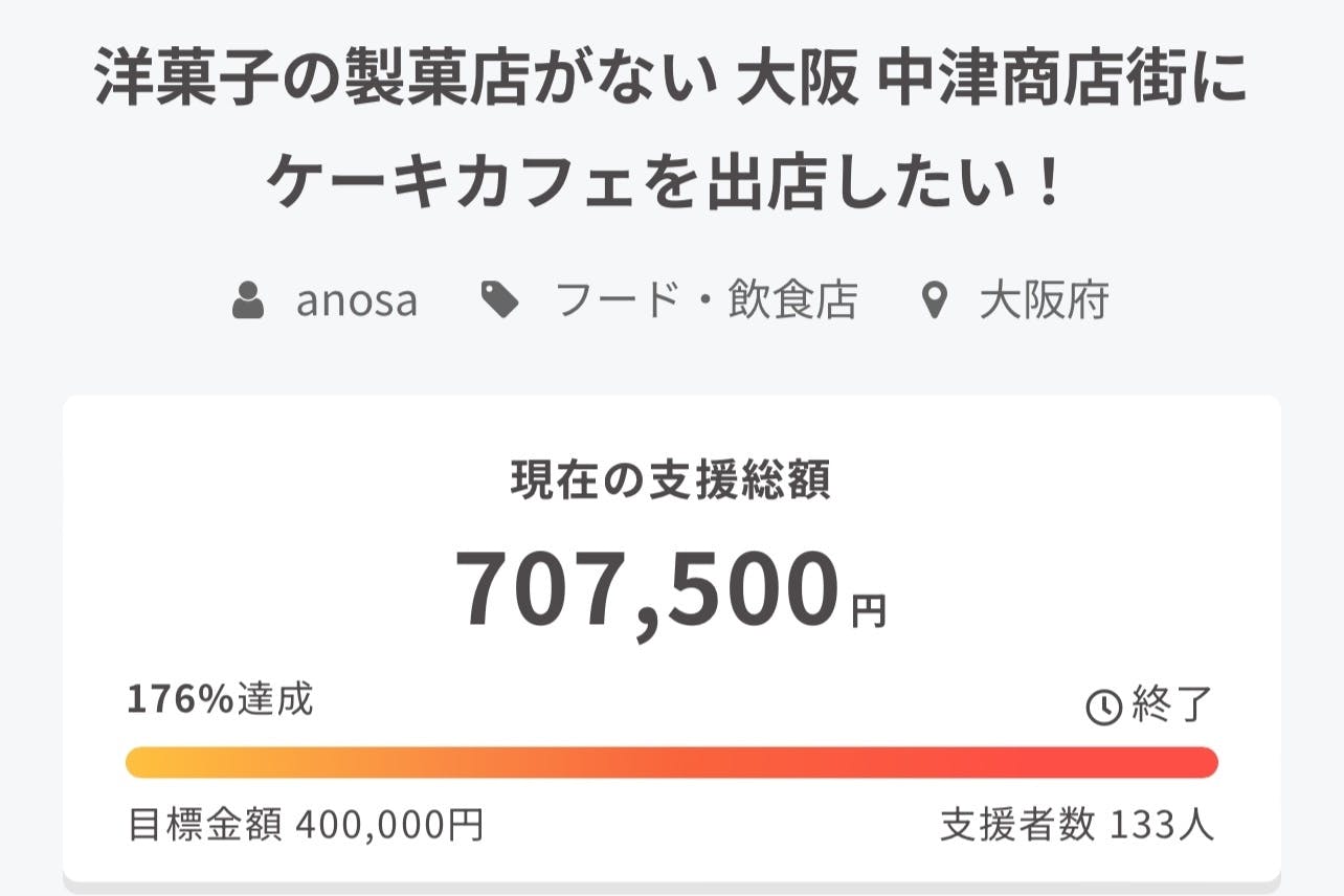 2024/07/01 07:30 本日0:00、Cafe anosa のクラウドファウンディングが終了しました。おかげさまで皆様のお力添えをいただき、ファーストゴールもネクストゴールも達成することが出来ました。目標達成金額400,000円に対して707,500円、達成率176%のご支援を頂戴しております。Cafe anosaへのたくさんのご支援と応援に心より感謝申し上げます!今回のCafe anosaのクラウドファンディングはSUCCESSして終了となります。そしてこれからは本格的なオープンの準備です。Cafe anosaがオープンして皆様に美味しいリターンをお届けすること、そしてCafe anosaで今回お世話になった支援者の皆様の御来店をお待ちすることを、私自身とても楽しみにしております。オープンまでの進捗は、またこちらの実績報告でお知らせいたします。支援者の皆様、Cafe anosaにもうしばらくお付き合いいただければ嬉しいです。 もっと見る