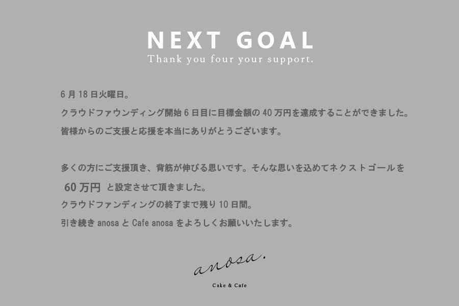 ファーストゴールでは、最低限の看板と告知をするために必要な広告費として目標金額を設定しました。 次のネクストゴールでは、もっとたくさんの方にCafe anosaを知っていただける様に、広告のクオリティーを上げたいと考えています。