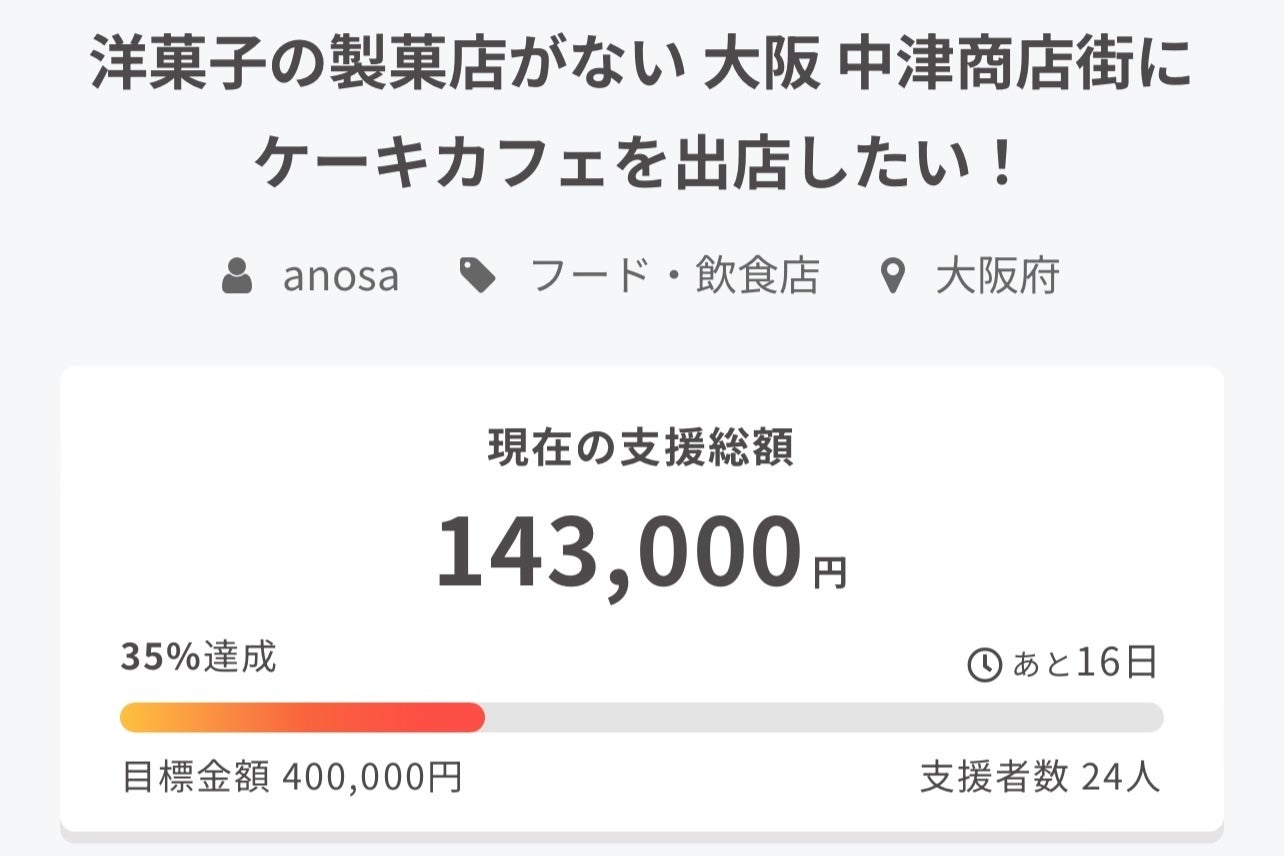 先日、公開いたしましたクラウドファンディングですが、目標達成金額400,000円に対して、現在143,000円、達成率35%のご支援を頂戴いたしました。