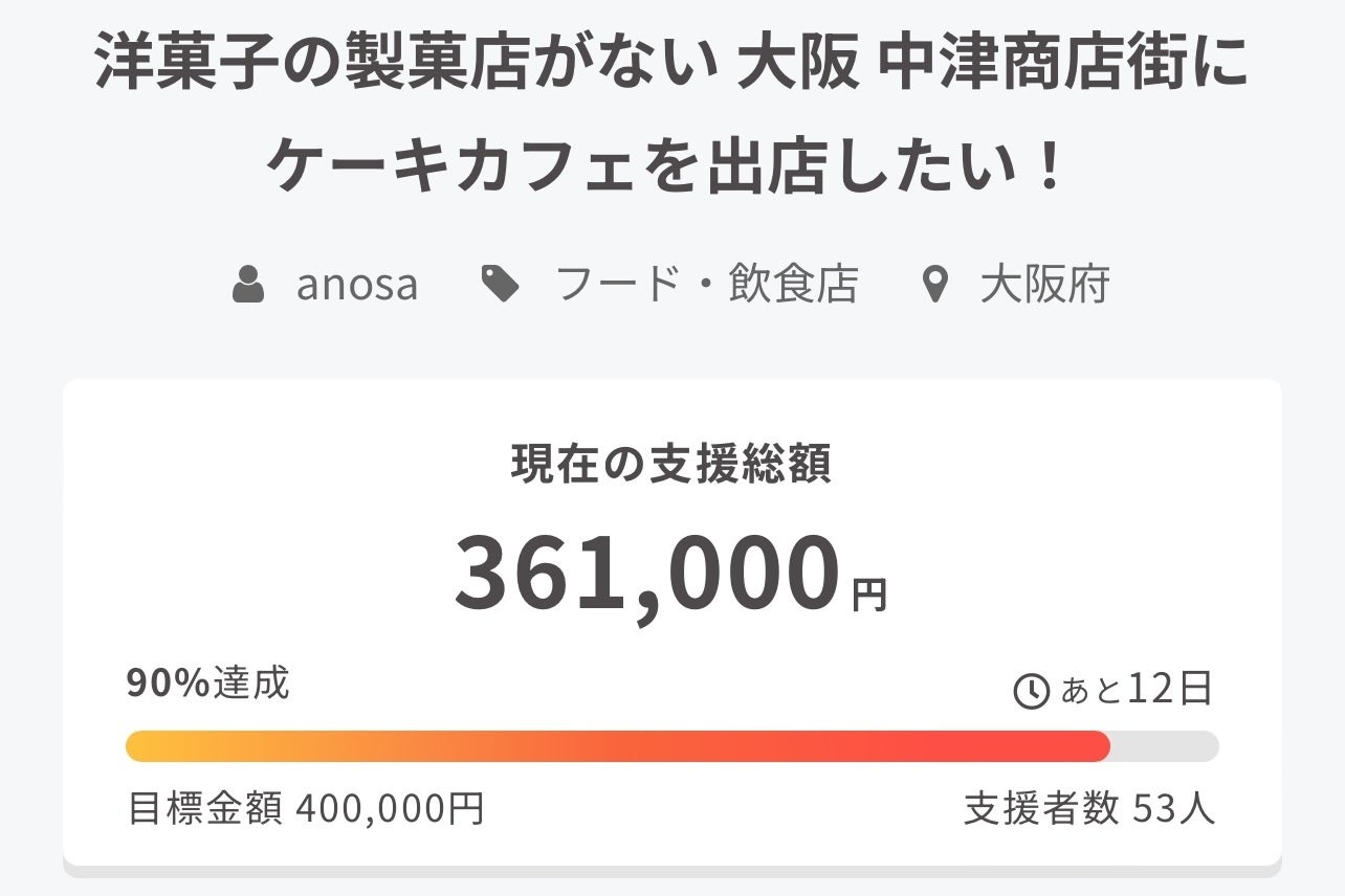 目標達成金額400,000円に対して、現在361,000円、達成率90%のご支援を頂戴いたしました。Cafe anosaへのご支援と応援に心より感謝申し上げます。