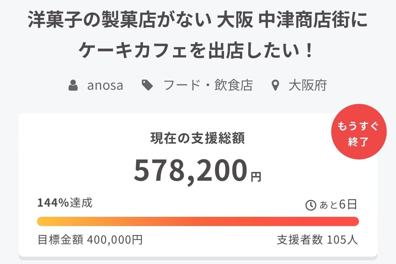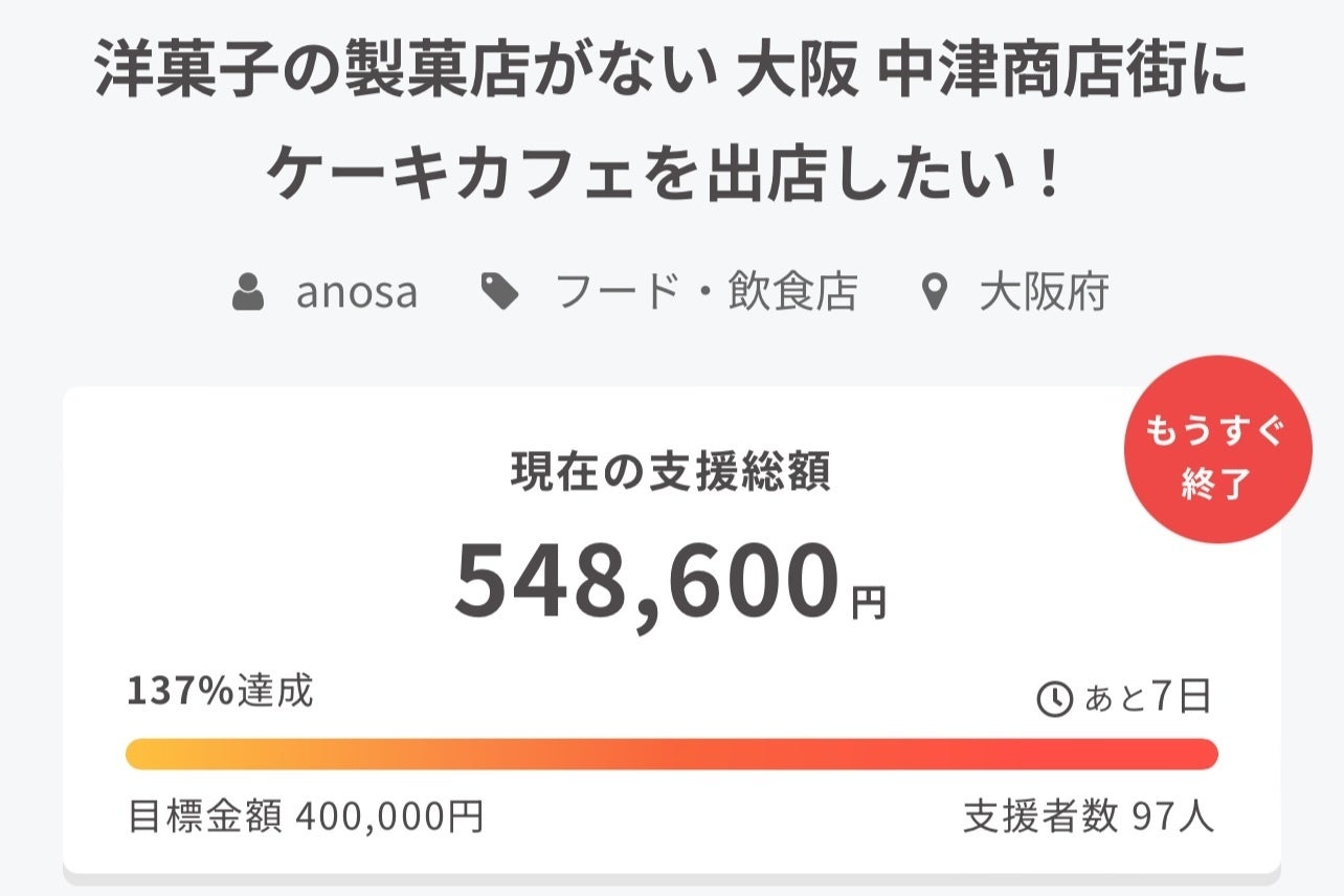 Cafe anosa クラウドファウンディング10日目、ネクストゴールチャレンジのご報告です。本日は出店先にてクラウドファウンディングのご支援をたくさんいただきました。現在、目標達成金額400,000円に対して、548,600円、達成率137%のご支援を頂戴しております。皆様のCafe anosaへのご支援と応援に心より感謝申し上げます。セカンドゴールの600,000円まで、あと51,400円となります。残り期間は1週間となりますが、引き続きのご支援と応援をどうぞお願い申し上げます。