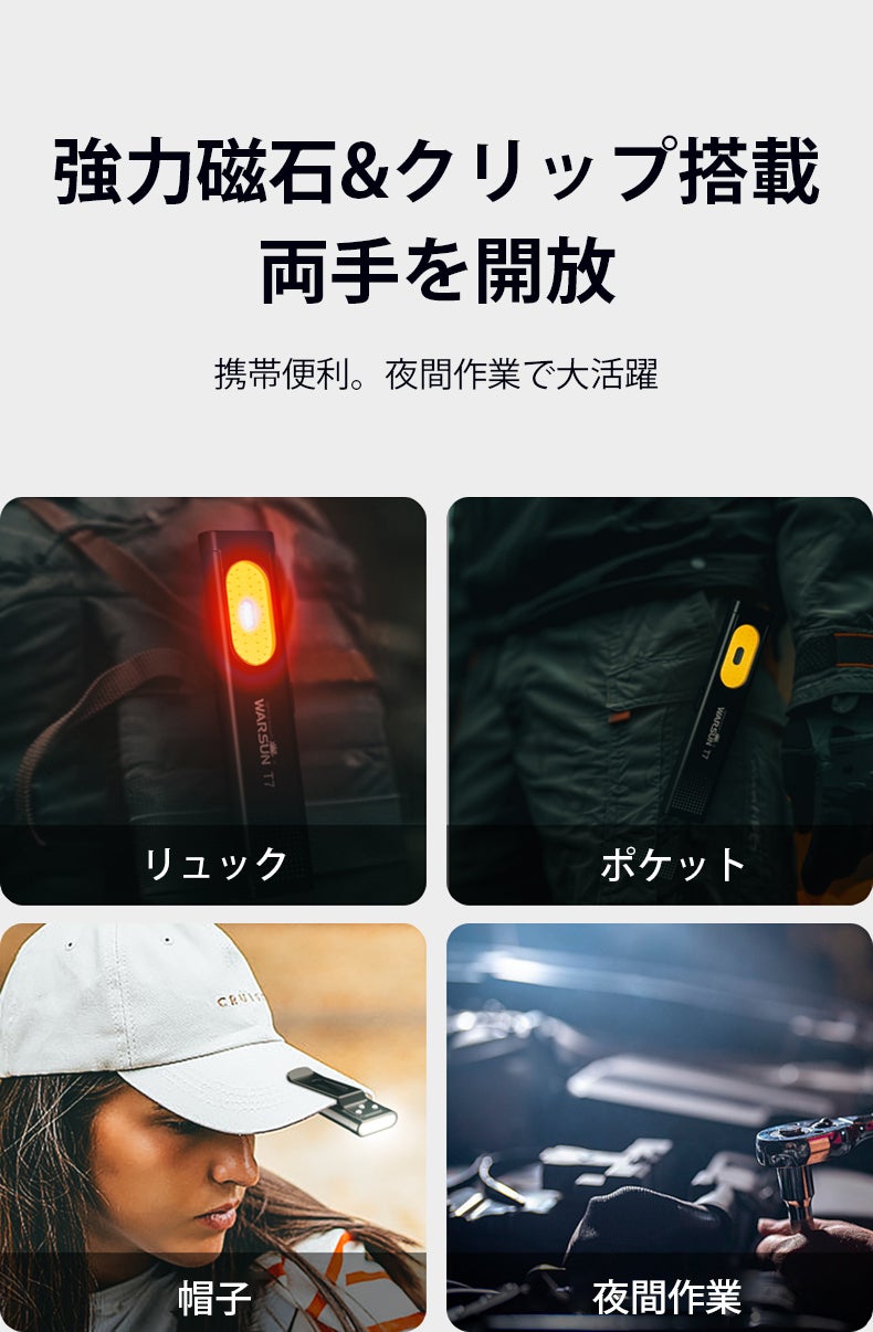 また、強力マグネット採用で両手が自由に使えるので、夜間に車の整備をしたり、ライトで照らしならがら物を探せます。