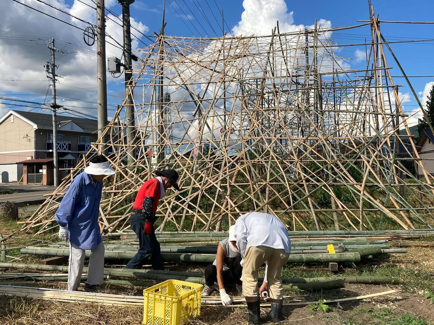竹を編む制作の手伝いにもいろんな人が参加してくれて、みんなで協力して巨大な松糸道路の盛り土の形を作り上げていきます。