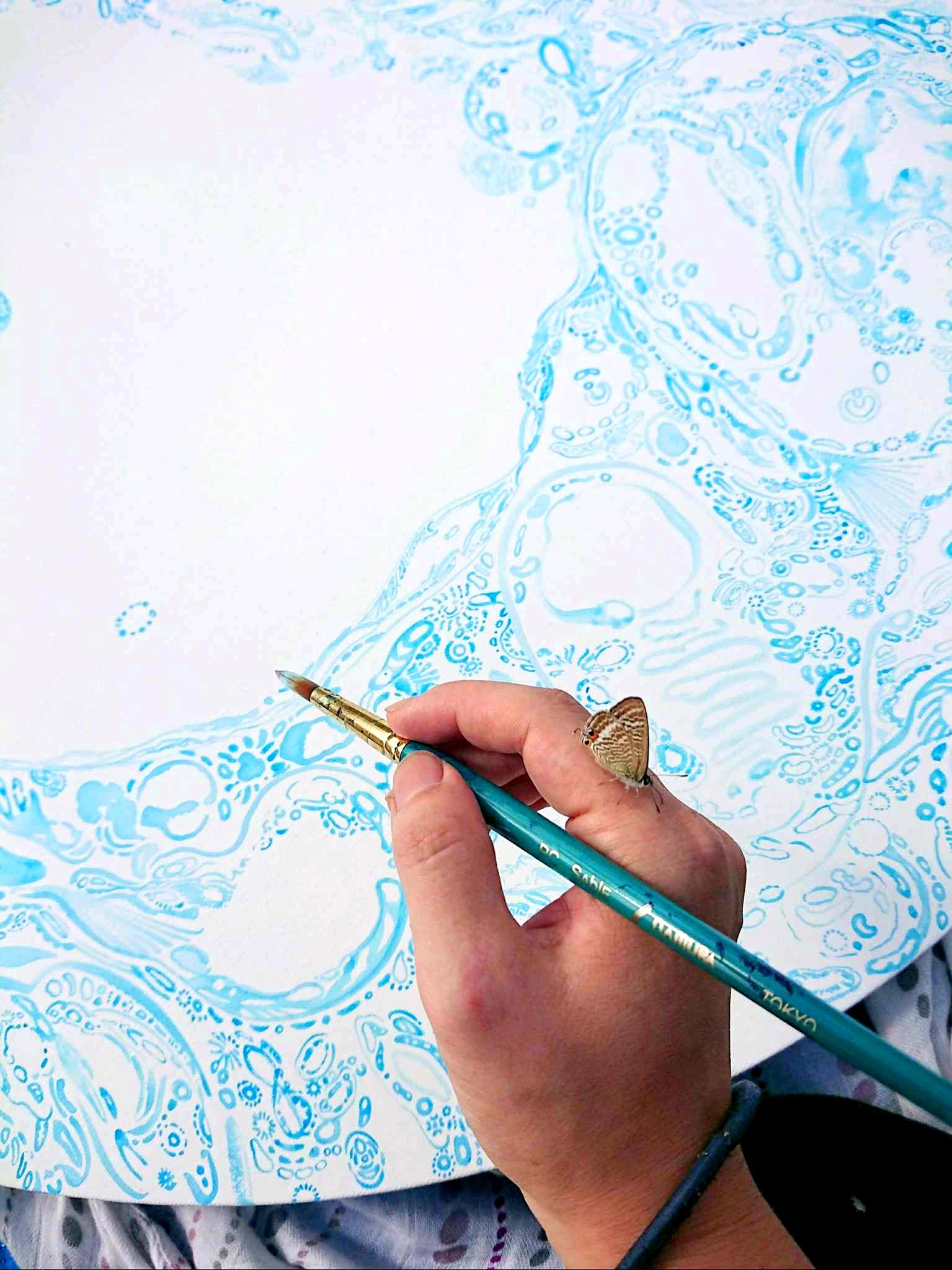 絵描きの鈴木彩花と申します。 わたしが初めて大町を訪れたのは 2011年の夏、現地の美術祭を観に来たことがきっかけでした。 そのときわたしは19歳で 初めてひとりで長野県を訪れました。 無人駅の稲尾に降り立ったとき 目の前に広がる山々と 木崎湖の、ピンと鏡のように張った湖面。 成長中の稲が活き活きとしている田んぼの美しさに息をのみました。神奈川県の街育ちだったわたしは、圧倒的に自然にあふれた大町の土地に惹かれ、毎年通うようになりました。 そのうち、地元の米農家さんやブルーベリー農家さんのお手伝いさせてもらえたり、たくさんの時間を過ごすことができました。 毎年触れるもの全てが新鮮で、生きていくなかでとても大切な経験をさせてもらっています。 大町の自然や景観は、わたしにたくさんのインスピレーションを与えてくれていて、木崎湖沿いで絵を描く時間は宝物となっています。 水のゆらめきを眺めていると、不思議な心地になります。 落ち着くような、包まれているような。 水が身近にある土地は とても豊かだと感じます。 松糸道路がつくられることで どのように景観が変わるのか 10年の建設の間、自然や生き物たち、わたしたちの生活への影響はどのようなものであるのか 10年以上関わってきて 一生ものの関係を築けている友人もいる大町のこれからを、わたしも知り一緒に関わっていきたい。 その想いをもとに、木崎湖のお水をいただき 水のゆらめきや、たくさんの生き物、 自然からのインスピレーションを得て描きます。 動き変化し続ける水の世界のように ひとつひとつ、形や模様は異なります。 手元にいつも水の流れを。 優しく包まれているようなお守りになるよう願いをこめて。 大町の未来のための力に 少しでもなれたら幸いです。 鈴木 彩花