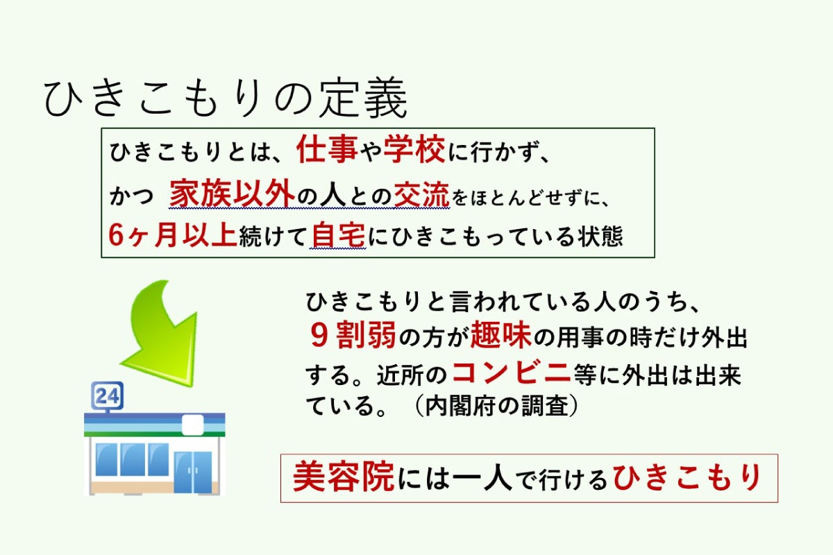 一人でならコンビニや映画鑑賞、美容院などには行けるけれど、家族以外の他人との交流がなければ、ひきこもりと判断されます。