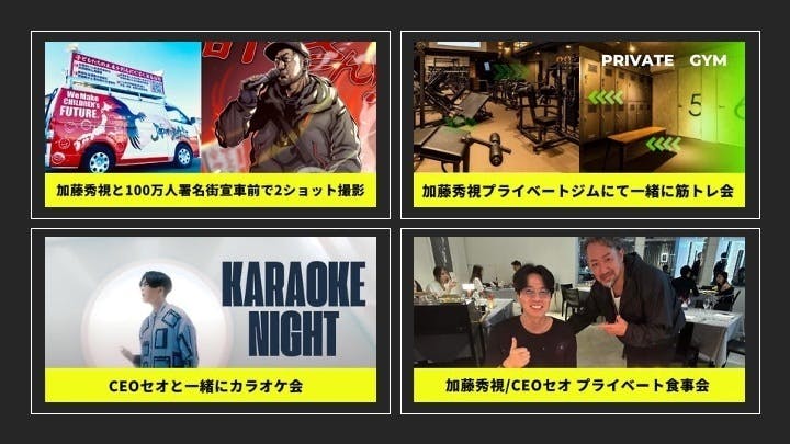 そこで筋トレ好きで知られる加藤秀視が普段使用しているプライベートジムで一緒に筋トレやアーティストとしても活躍するCEOセオとのカラオケ会など今後開催未定のリターンをご用意しました!