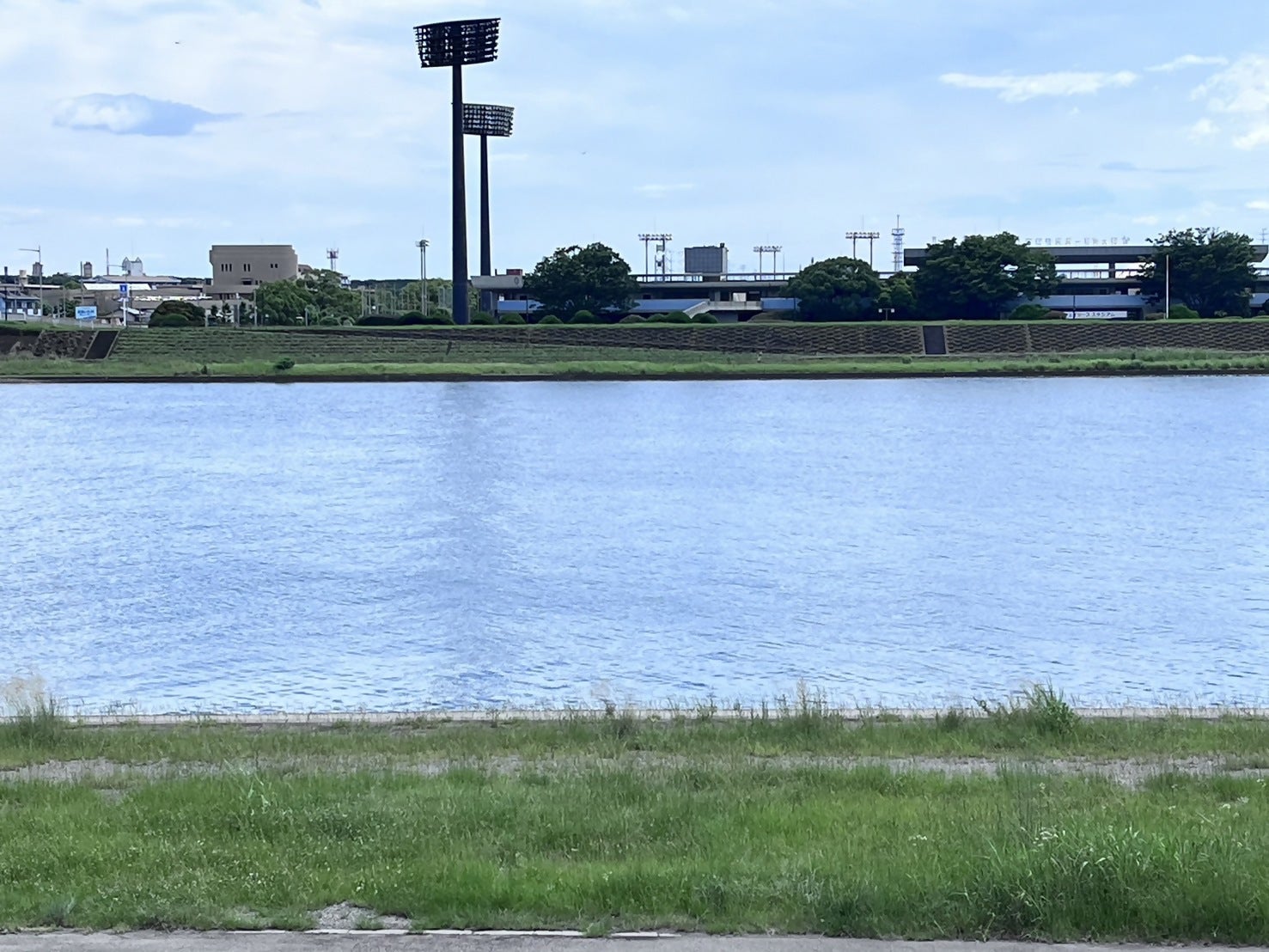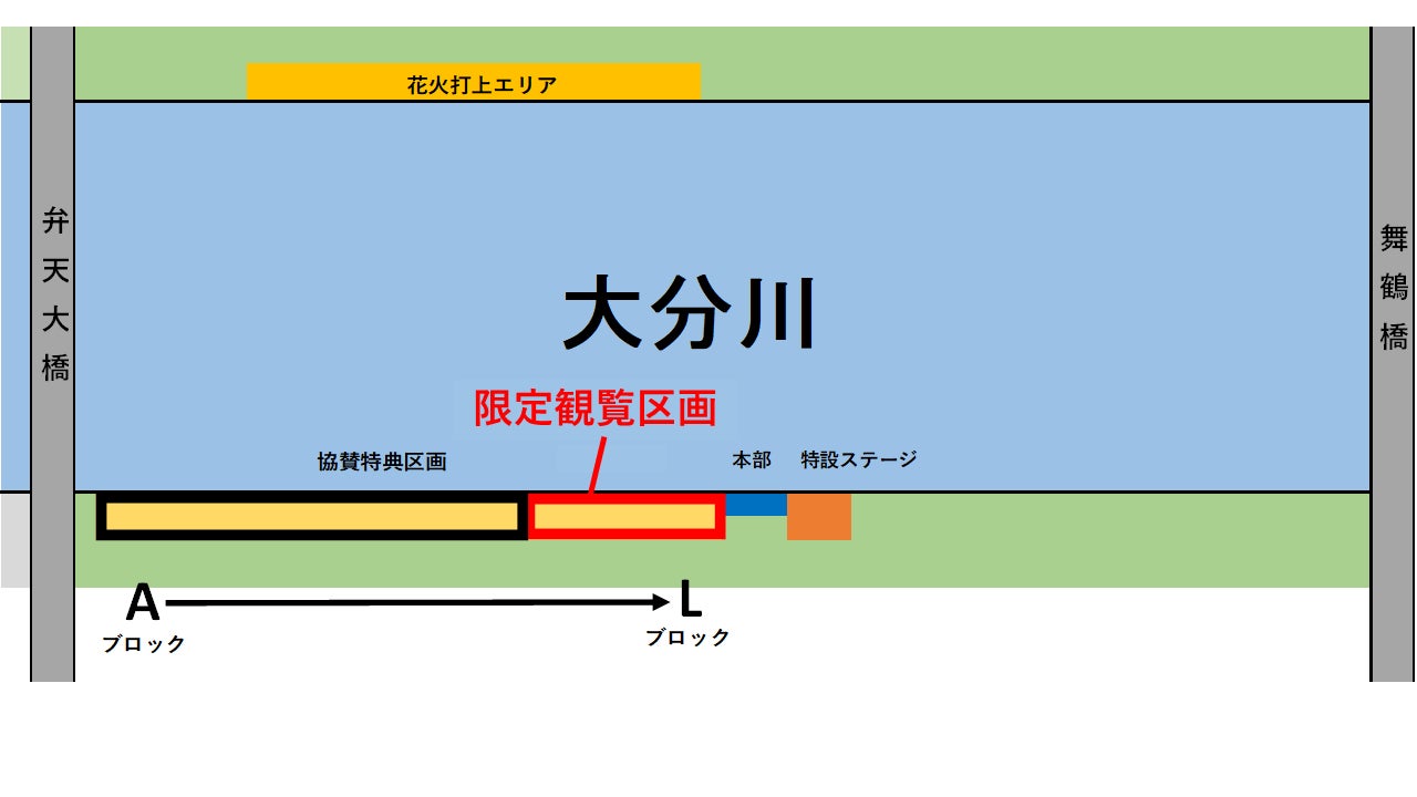 会場となる大分川弁天大橋上流。この対岸側でワイドに花火が打ち上がります。