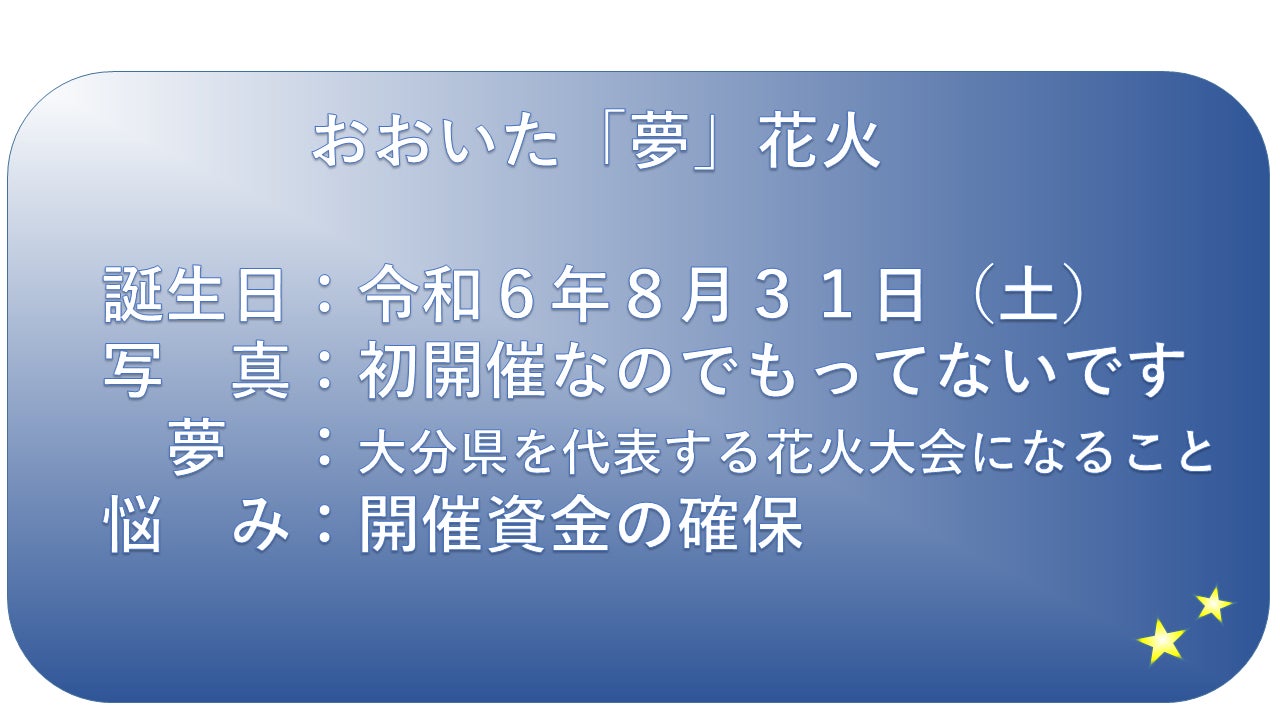 新たに今年スタートする花火大会が、今後末永く愛され大分の誇りになっていきますように・・・