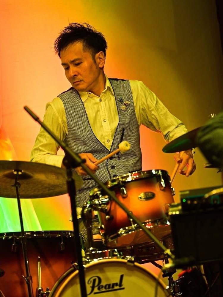 楽しいコンサートを届けてくれる、出演者のご紹介です。今回のコンサートのために特別出演のドラム奏者田中良明さん。いつもおしゃれで朗らかなヨッシーです。<田中良明 プロフィール>