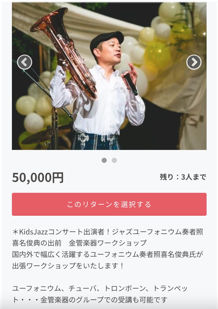 国内外で活躍するジャズユーフォニウム奏者の照喜名俊典さん。KidsJazzコンサートでいつも美しい音色と楽しいパフォーマンスを届けてくれる、根っからのエンターテナー。そんな照喜名さんの出張ワークショップが受けられるリターン品をご用意しています!グループで受けていただくことも可能です!吹奏楽ファンの皆様、子どもたちにコンサートもプレゼントできて、ワークショップも受けられます!この機会に是非いかがでしょうか。
