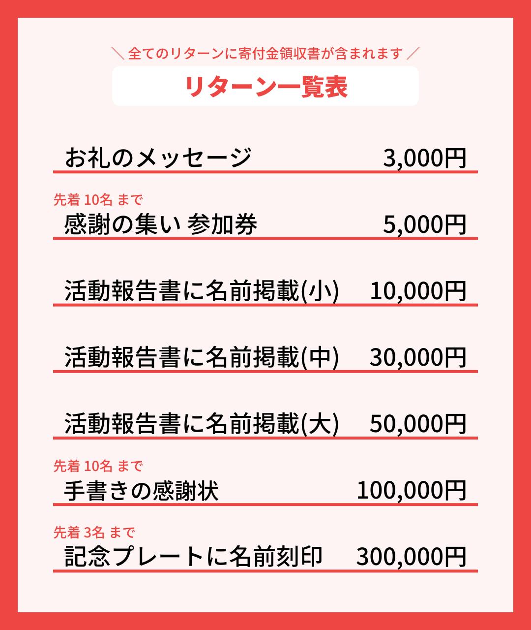 全てのリターンに寄付金領収書が付いており、どのリターンを支援いただいても寄附金控除の対象になります