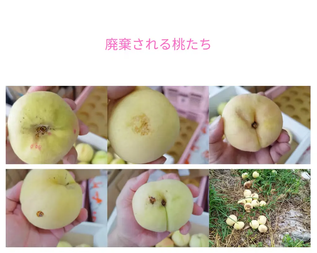 規格外と言っても、パッと見ためではわかりづらく、虫食い、変形、小玉、枝あたり等で自宅で食べる分には全く気になりません。しかし、岡山白桃の高品質を維持するには、廃棄せざるを得ない桃が沢山出てしまいます。毎日、畑へ廃棄するのも辛く、悔しい日々が続いておりました。