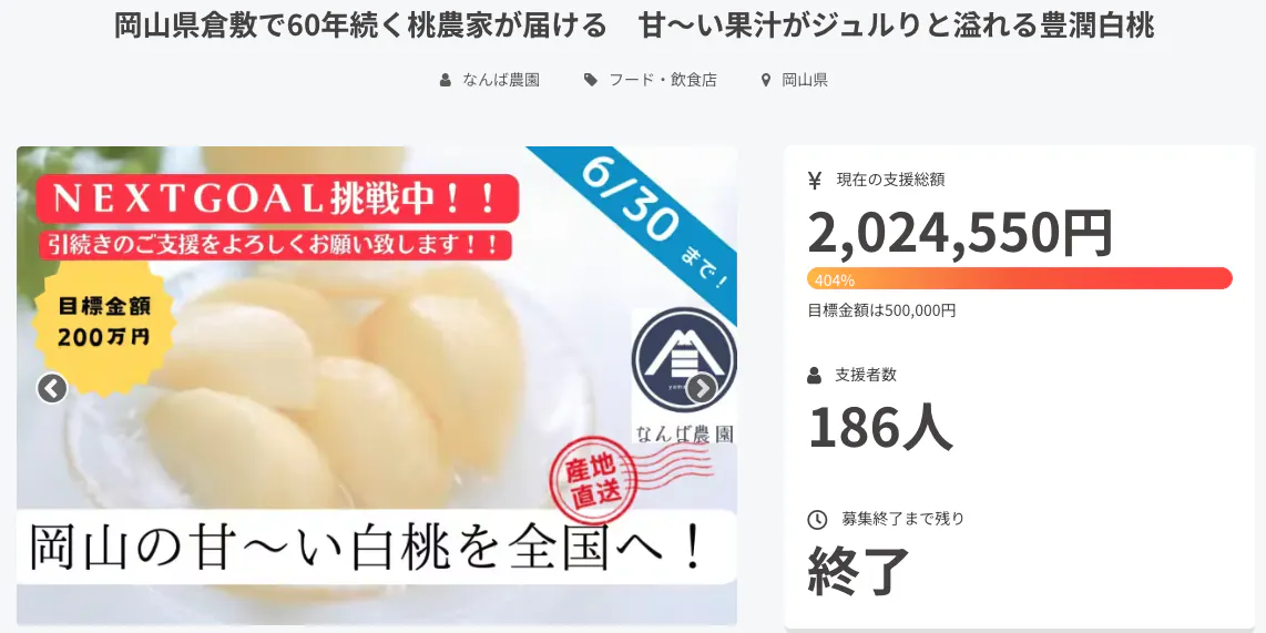 2024/10/03 09:30先日、ついに本プロジェクトが終了致しました。予想を超える沢山の方々による、多大なるご支援を賜りまして誠にありがとうございました。この場をお借りして、御礼申し上げます。リターン品発送は順次行ってまいります。プロジェクト結果は以下の通りです。達成率:174%支援総額:522,500円支援者数:85人皆様からいただいたご支援金は、商品製造費用、梱包・送料、CF手数料等で大切に使わせていただきます。当初の目標金額30万を達成することが出来ました。これもひとえに、私の桃作りに対する想いや農業界の厳しさなどに共感し、沢山のご支援をくださいました、皆さまのお陰でございます。クラウドファンディングを通じて、多くの学びもありました。クラウドファンディングは私のような、小規模農園が生き残ることができる、理想型のプラットフォームであり、手段であると感じました。今後は自社で生産できる体制を整備していくことが目標です。自社で加工品を製造することこそが、真の6次産業化と言えます。その為には、目の前の課題を1つ1つクリアしていくことが重要だと思います。今後も皆様にご支援いただけるような活動を継続していきます。今後ともよろしくお願い申し上げます。この度は誠にありがとうございました。なんば農園代表 難波頌治 もっと見る