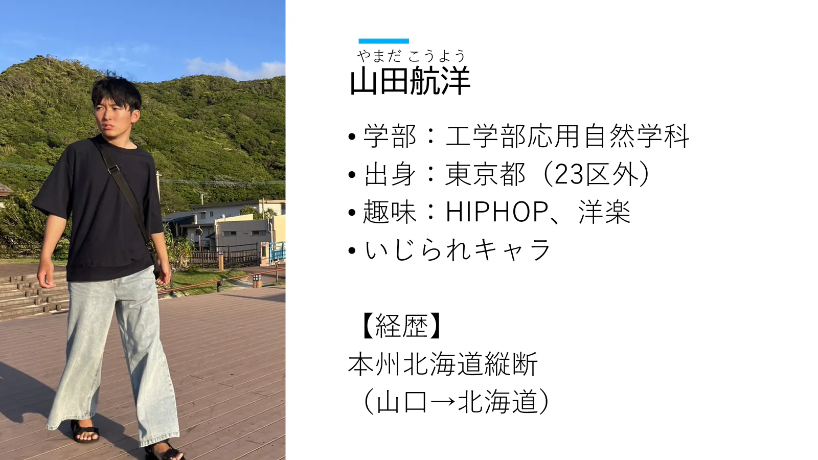 ある先輩の言葉で「一を投げたら五が返ってくる」っていうのが適切なほど、彼は会話がうまい。そんな彼はヒップホップや洋楽が大好きで、逆に日本のアーティストやロックバンドにめっちゃ疎い。理系だが数学よりも英語が得意で、英語で大学はいったようなもんだと言っている。現地で困ったら頼りにさせてもらおう。彼はとにかく温厚で情緒を乱しているところはほとんど見たことがない。かなりおっとりした性格だが、「うるせえ、行くぞ!」くらいのノリでいろいろ誘えば意外と来てくれる。去年の夏には山口から札幌までの自転車旅をして日焼けで真っ黒になっていたため、今回のヨーロッパ縦断では再び日焼けした姿を拝むことができるかもしれない。
