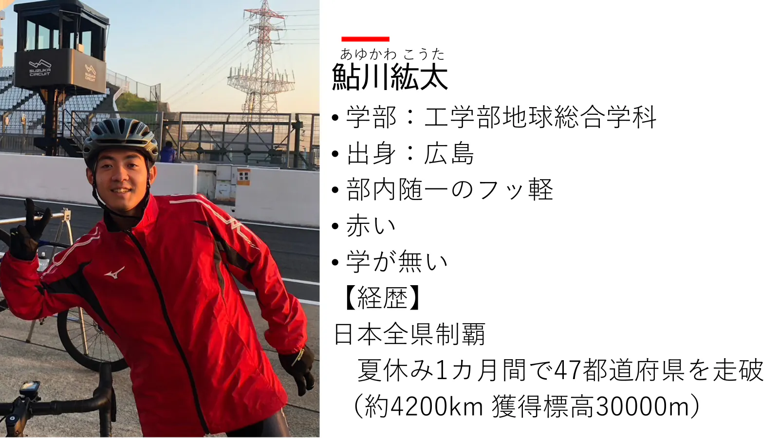 ヒルクライムいこうと言えば来てくれるし、飯いこうと言えば来てくれるし、ドライブいこうと言えば来てくれるし、麻雀やろうと言えば来てくれる彼は部内随一のフッ軽である。そんな彼のイメージカラーは赤。何が赤いかというと何もかもが赤い。Wilier の赤いロードバイクに赤い服を着て跨がる。そして、チームカラーが赤色である広島東洋カープの大ファン。そんな彼は学がないとよくいじられている。特に漢字と歴史の知識は壊滅的だ。日本各地ゆく先々で歴史系の会話についていけないのを嘆いている。自転車が大好きで、去年の夏休みには沖縄を除く日本の全都道府県を走破するという狂人的なチャレンジをした。んー、とんでもない。