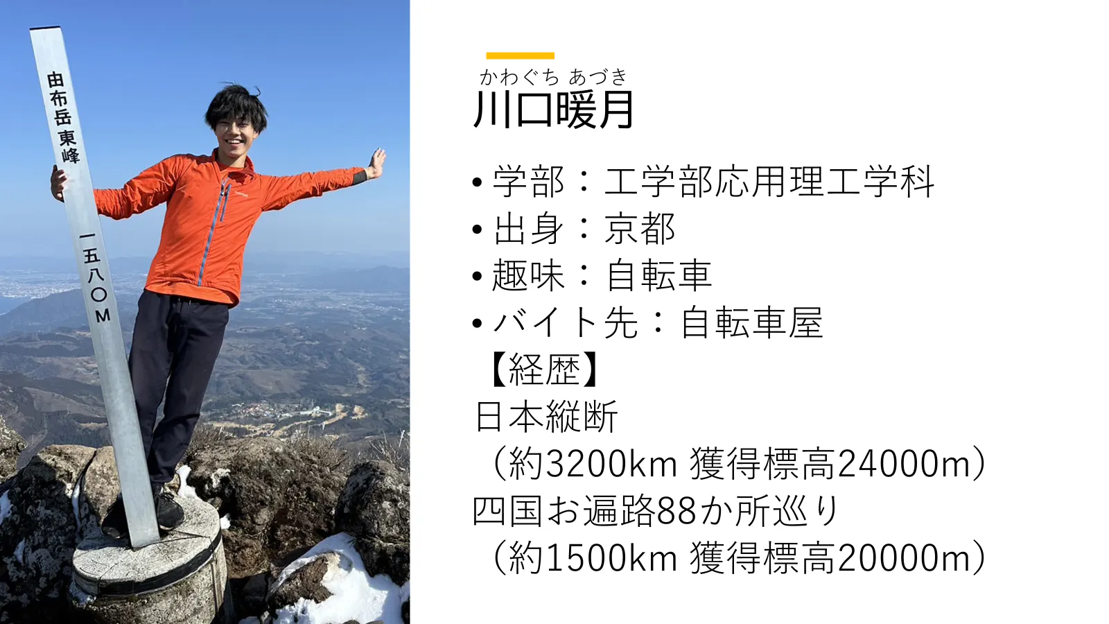 彼は自転車なしでは生きていけないと言っても過言ではないくらい自転車が大好きな男である。京都で実家暮らしをしている彼は、毎週の部活に 100km 弱の距離を漕いで来ている。自転車屋でバイトをしており、困ったら彼に聞けば万事 OK!と言いたいところだがまだまだ未熟らしく、困ったらバイト先の店長に電話して遠隔修理してもらう予定だそうだ。これまで自転車で様々な場所を旅しており、経歴の欄に挙げているものの他には、冬の北海道で年越しをしたり、知多半島・渥美半島・伊豆半島・房総半島を6日で1周したりなどなど精力的に活動している。