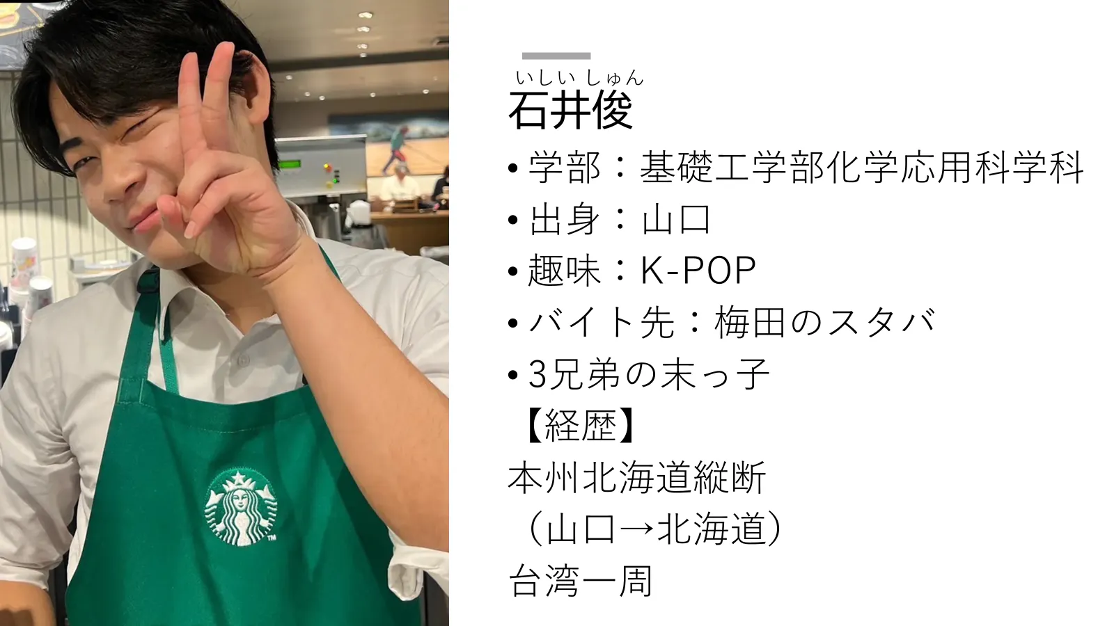 彼の特徴として一番に思い浮かぶのは訛りである。鹿児島出身である彼は、その独特なかわいい訛りでみんなを癒やしている。そんな彼は超多忙で有名な薬学部の授業をこなしつつ、週に4日とか5日とかのバイトをするかなりすごい人だ。Mrs. GREEN APPLE や ONE OK ROCK をこよなく愛し、ライブにも参戦している。性格は明るめで人当たりも良い。安全運転に定評のある彼がいれば怪我なく帰国できること間違いなし!