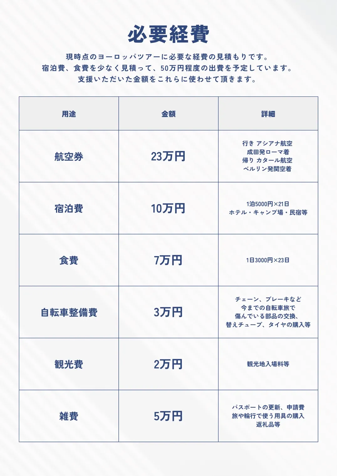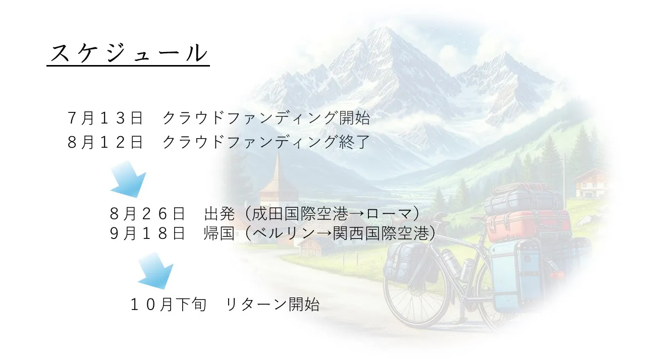 私は今まで自転車旅を通して様々な出会いに恵まれてきました。このヨーロッパツアーでもそのような機会を大切にし、支援をしてくださる全ての方々の期待に応えられるよう、感謝の気持ちを忘れず無事ツアーを成功させます。