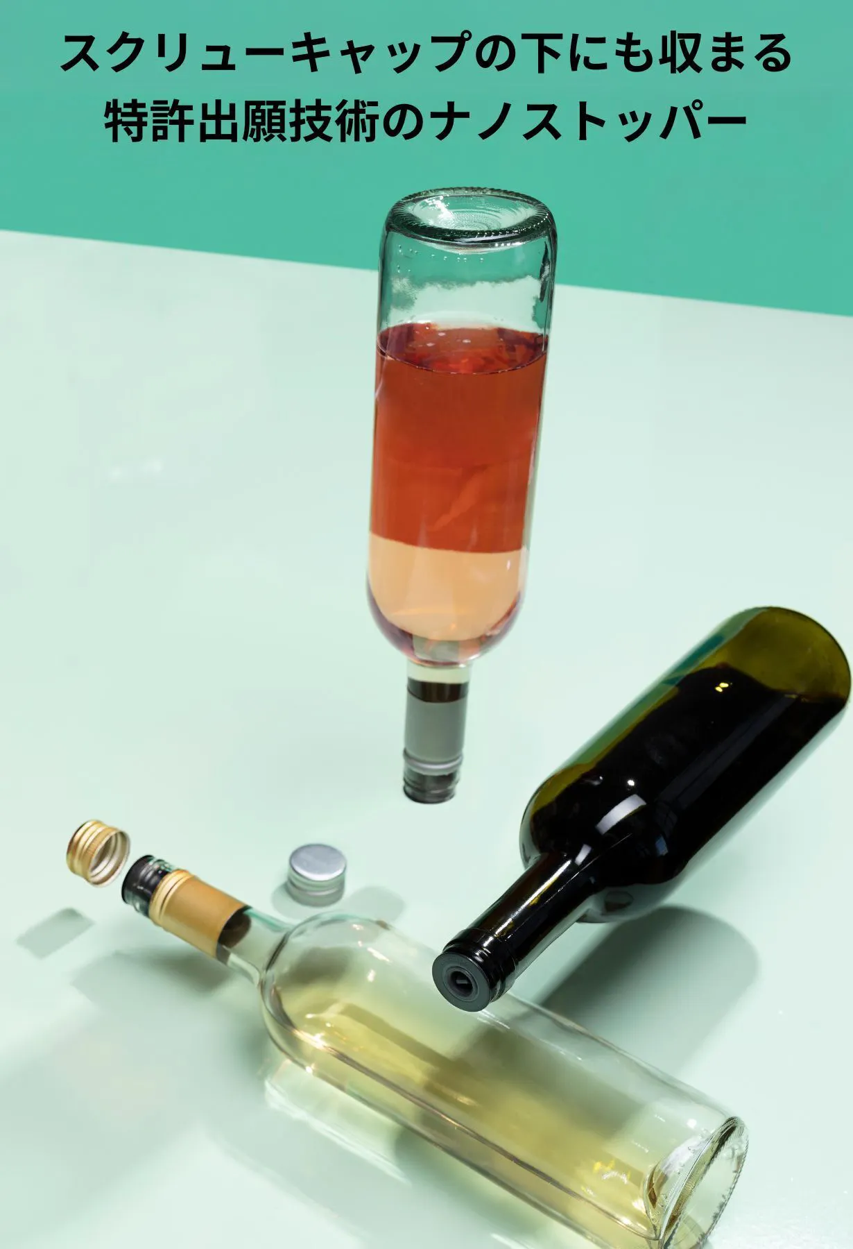 ワインに利用する際は、コルク栓でもスクリュー栓でも使えます。また、ナノストッパーはとてもコンパクトなので、スクリューキャップの下にも収まります。