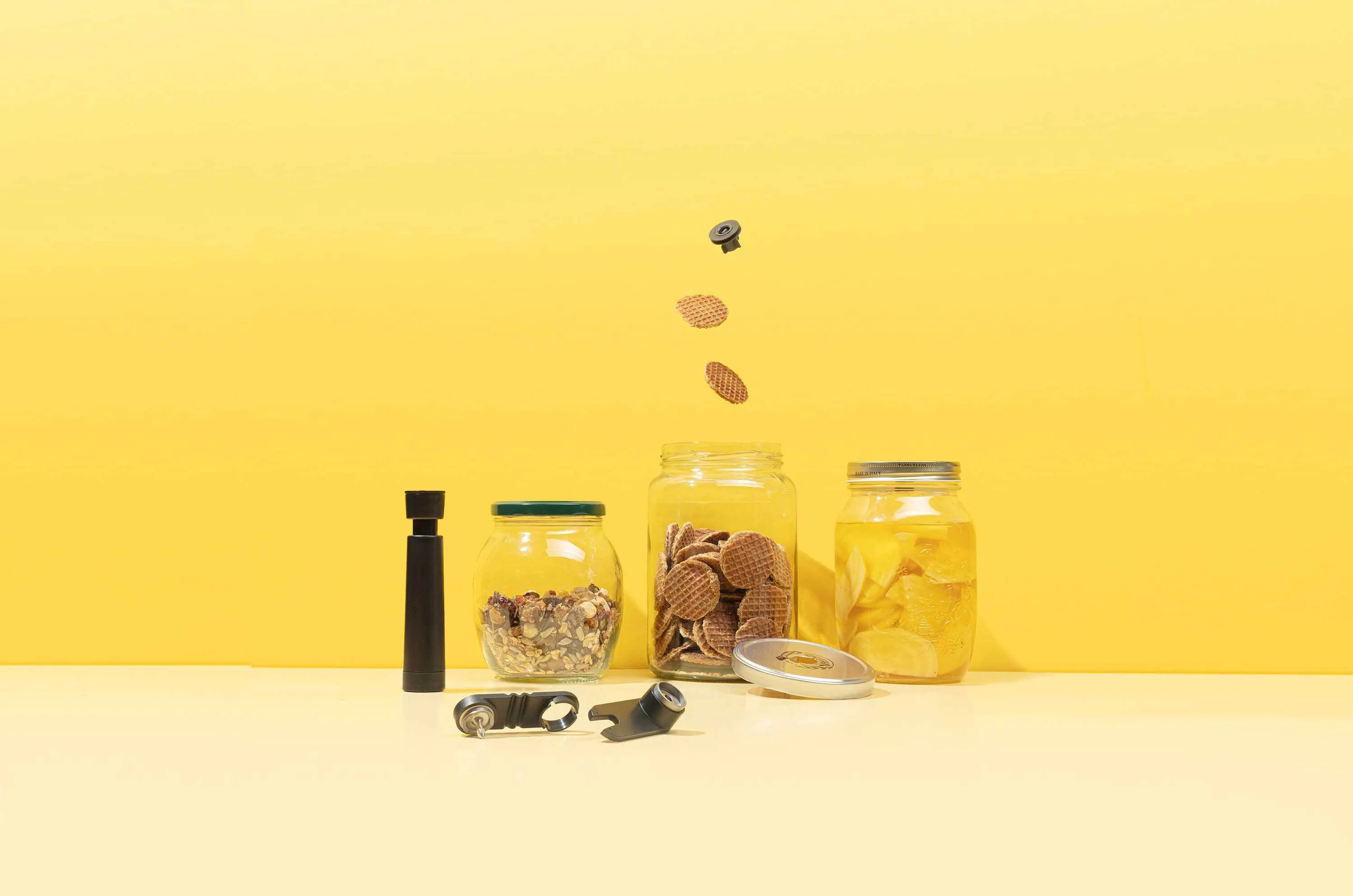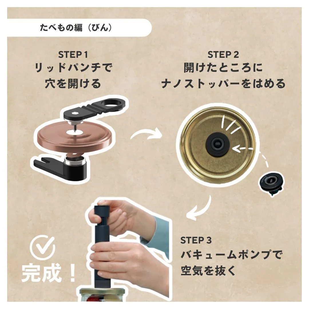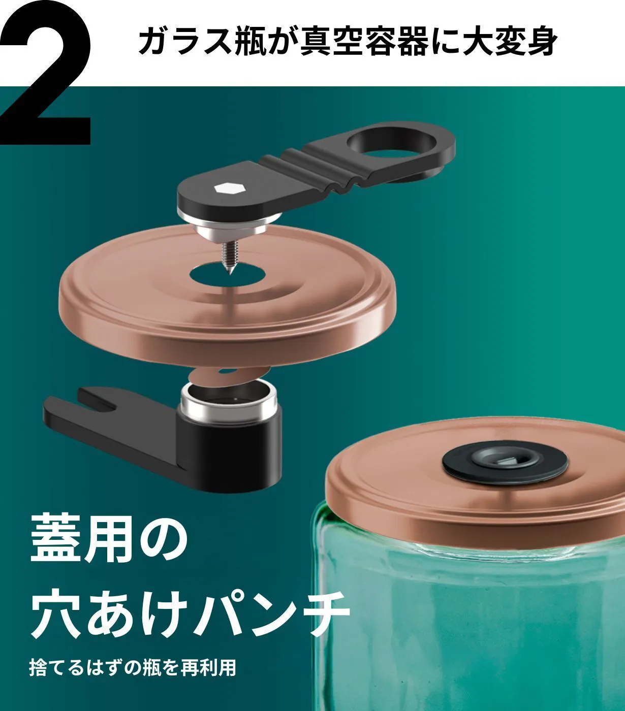 エアテンダーの真空ツールを使えば、付属のパンチで金属製のふたに素早く、安全に穴を開けることができ、自分専用の真空容器が完成します。